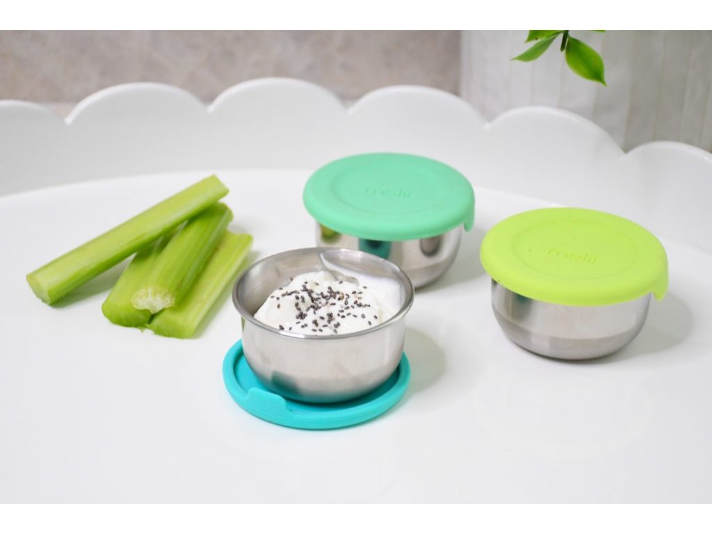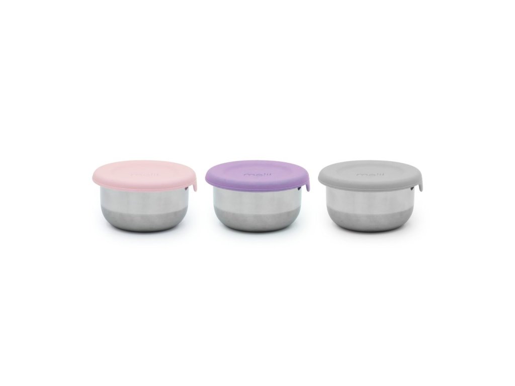 Sada obsahuje 3 nerezové mištičky s objemom 89 ml s farebnými silikónovými viečkami, ktoré perfektne tesnia a pomáhajú udržať jedlo dlhšie čerstvé. Vďaka tesniacemu viečku sú vhodné na prenášanie potravín bez rizika úniku. Dózičky sú odolné, ľahké a nepriepustné. Diely kompaktnej veľkosti a designu sa ľahko zmestia do každej desiatovej krabičky či bento boxu.