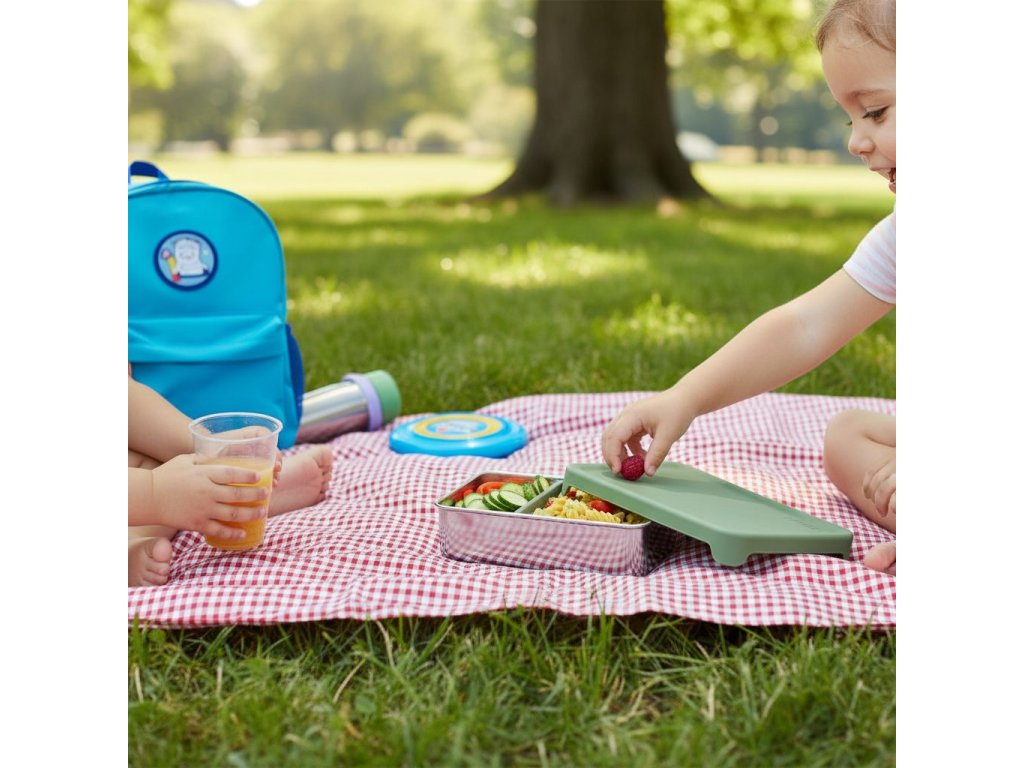 Varovné a bezpečnostné informácie: Nevhodné pre deti mladšie ako 3 roky. Nie je určené na prenášanie tekutín. Niektoré potraviny môžu spôsobiť zafarbenie výrobku; toto nemá vplyv na funkčnosť a nie je dôvodom na reklamáciu. Neodporúčame používať na potraviny teplejšie ako 45 °C – hrozí riziko obarenia.Neponechávajte dieťa bez dozoru dospelej osoby. Nenechajte dieťa pri používaní výrobku behať ani sa inak pohybovať. Vždy skontrolujte teplotu jedla pred podaním dieťaťu.Viečko nasaďte na krabičku iba vtedy, ak je obsah studený.