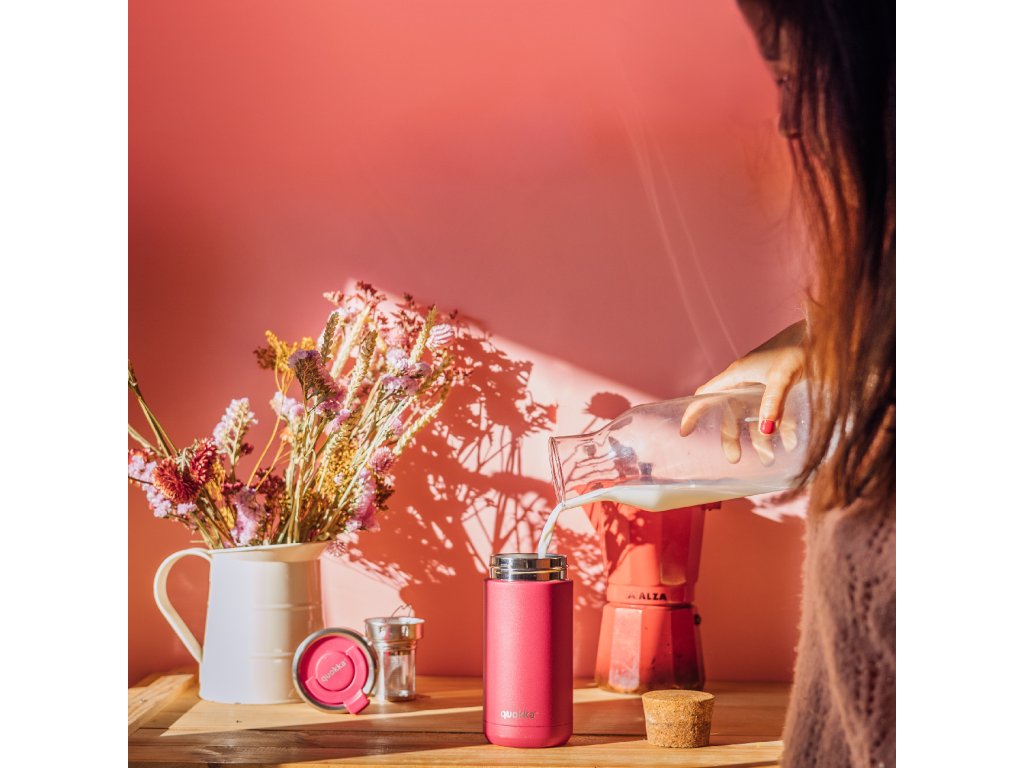 Súčasťou termohrnčeka je vyberateľné sitko, vhodné napr. na sypaný čaj. Široké hrdlo umožňuje vloženie kociek ľadu.
