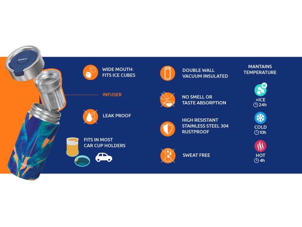 Termohrnček Quokka Boost z vysoko kvalitnej dvojstennej ocele so spoľahlivým, 100% tesniacim uzáverom udrží váš nápoj podľa potreby teplý či studený. Termohrnček udrží teplotu studeného nápoja s ľadom až 24 hodín, studeného nápoja až 10 hodín a teplého nápoja až 4 hodiny.