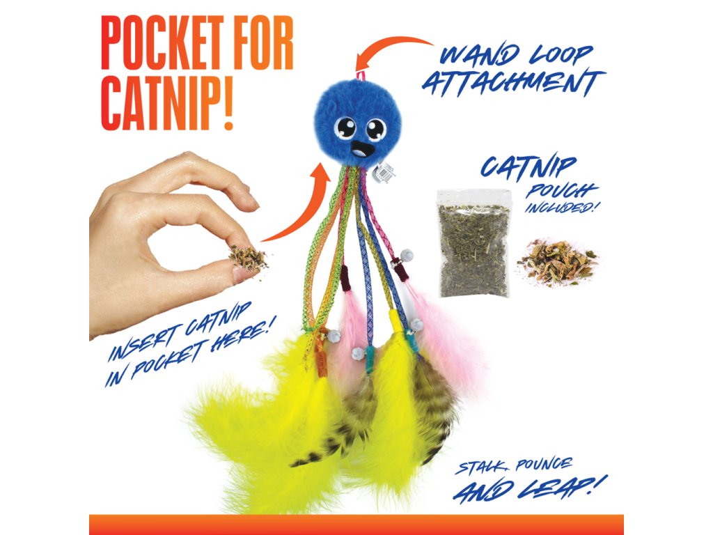Telo hračky kombinuje odolný nylonový plášť s „ultraplush“ povrchom (mäkký, príjemný na dotyk) a pružné lanká/„nohy“ chobotnice, ktoré pri pohybe vibrujú alebo sa vlnia – to napodobňuje pohyb koristi a stimuluje mačku. V konštrukcii sú zabudované aj rolničky, ktoré zvyšujú záujem mačky o hru. Ďalej hračka obsahuje tyčku so šnúrou, čo umožňuje majiteľovi viesť hru - pohybovať hračkou vo vzduchu či po zemi, a tým aktivovať mačacie lovecké inštinkty.