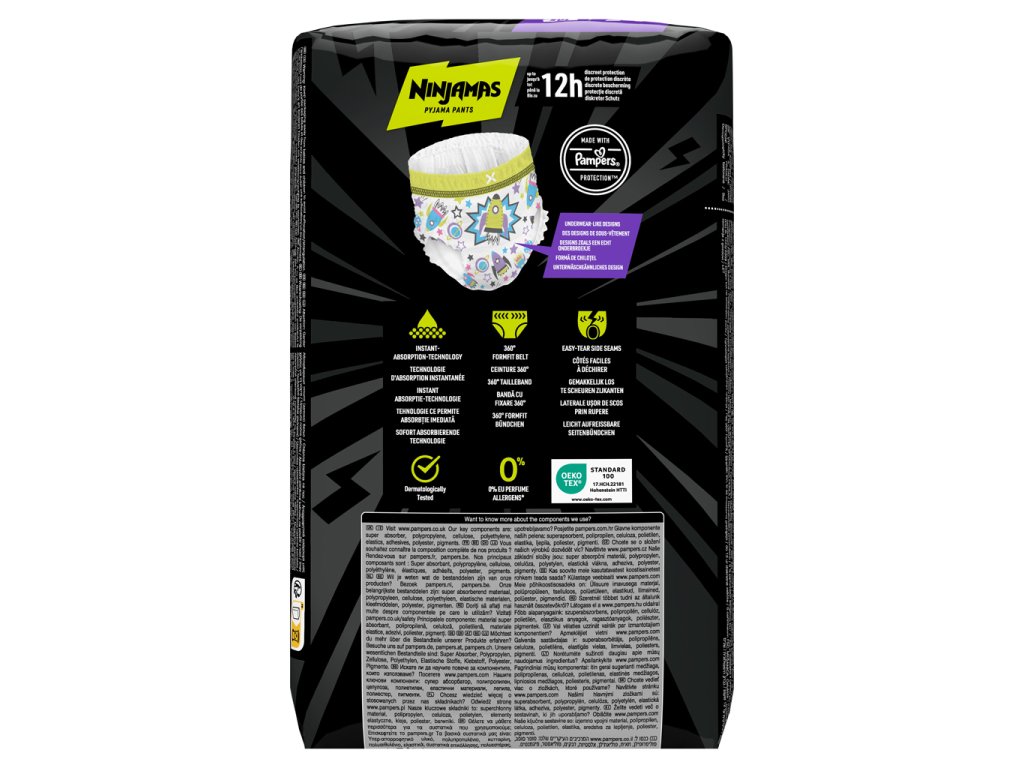 Rovnako ako pre vás, aj pre Pampers je bezpečnosť vášho dieťaťa prvoradá: Pyžamové nohavičky Ninjamas sú dermatologicky testované, neobsahujú žiadne vonné alergény zo zoznamu EÚ (podľa nariadenia Európskeho parlamentu a Rady (ES) č. 1223/2009 o kozmetických výrobkoch) a certifikované podľa normy Oeko-Tex Standard 100.