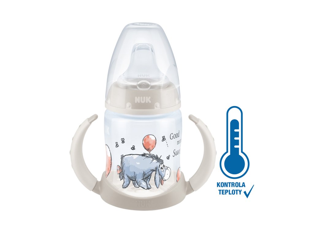 Detská fľaška na učenie NUK Disney Macko Pú First Choice s kontrolou teploty, 150 ml, nekvapkajúca, bez BPA, 6-18 mesiacov.