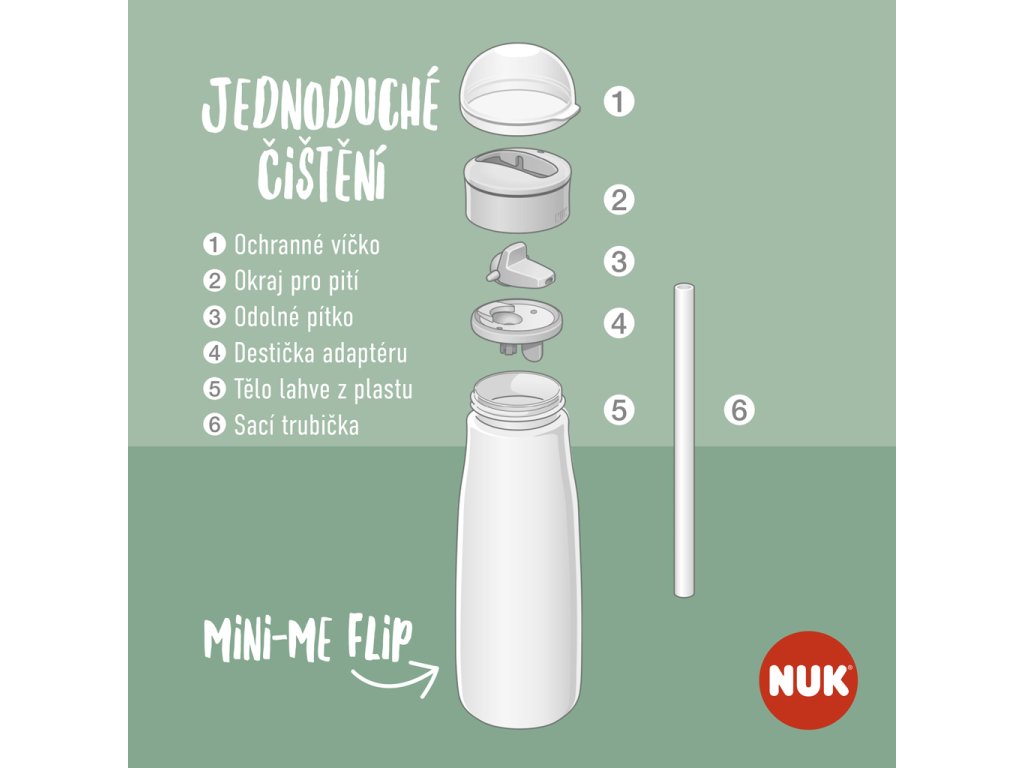 Pre Mini-Me Flip z PP: Fľaša je tiež vhodná na umývanie v umývačke riadu. Pri čistení v umývačke riadu môže dôjsť k poškodeniu materiálu agresívnymi čistiacimi prostriedkami.