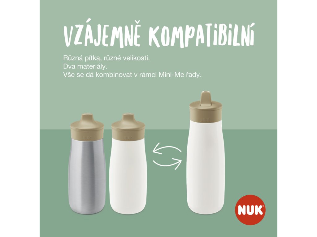 NUK Mini-Me je systém, ktorý rastie spolu s vaším dieťaťom. Vyberte si medzi nerezovou oceľou a nerozbitným plastom. Vyberte si z rôznych veľkostí. Vyberte si z pevného alebo vyklápacieho pítka. A môžete si zostaviť presne takú fľašu, akú potrebujete pre svoje dieťa. Nech už si vyberiete akýkoľvek model, fľaša netečie a je veľmi odolná. Stvorená pre prvé dobrodružstvá a všetko, čo príde po nich.