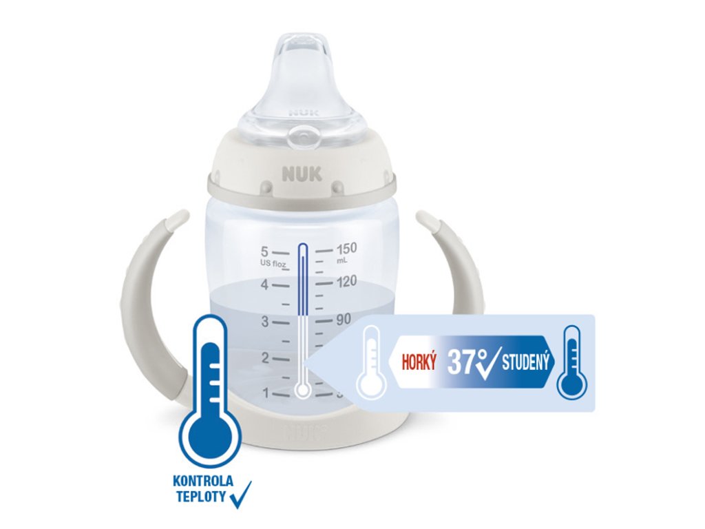Fľaštička na učenie First chioce značky NUK má mäkké silikónové náustok s antikolikovým systémom, takže minimalizuje vznik koliky. Fľaštička je určená pre deti od 6 do 18 mesiacov. Praktické držadlá sa postarajú o bezpečný úchop a ľahký prechod na samostatnej pití. Indikátor kontroly teploty - modrá farba sa zmení na bielu, ak je obsah príliš horúci.