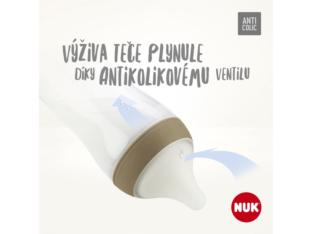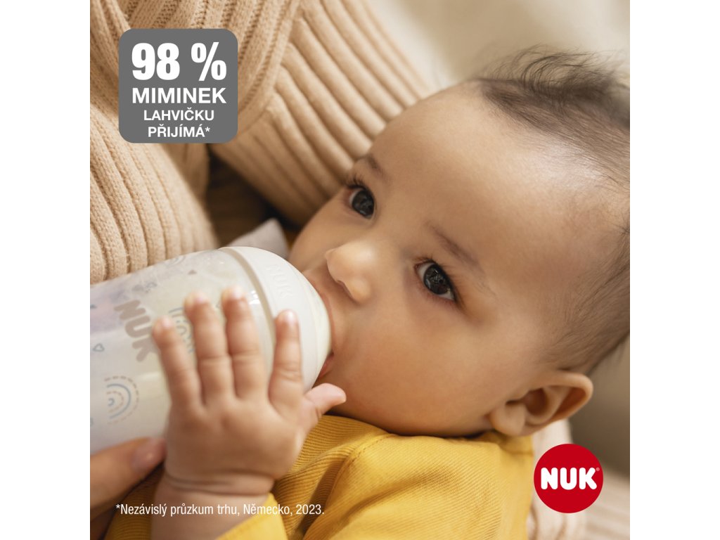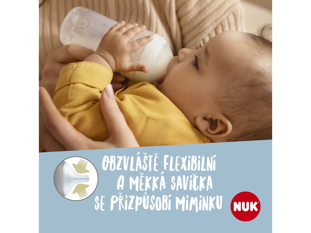 Uchovávajte v suchu a hygienicky. Pri čistení používajte umývací prostriedok NUK alebo jemný prostriedok na ručné umývanie a zvyšky potravín odstráňte tiež zo skrytých oblastí. Ak je to potrebné, výrobok namočte, v žiadnom prípade neškriabte vnútro fľaše. Dôkladne prepláchnite. Cumlíky a fľaše nepatria do umývačky – hrozí poškodenie materiálu pôsobením čistiacich prostriedkov pre umývačky! Niektoré potraviny môžu spôsobiť zafarbenie materiálu (napr. mrkvová šťava) alebo spôsobiť zápach (napr. feniklový čaj). To neobmedzuje vhodnosť