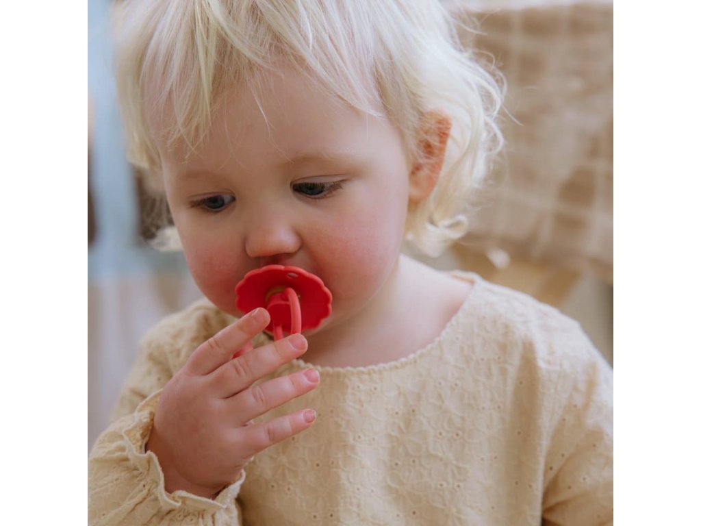 Kvet maku s jemnými, papierovými okvetnými lístkami je inšpiráciou pre túto novú farbu FRIGG; krásny a výrazný červený odtieň. Vibrujúci kvet maku je podstatou očarujúcej krásy a cumlíku FRIGG Daisy prináša jedinečné čaro.