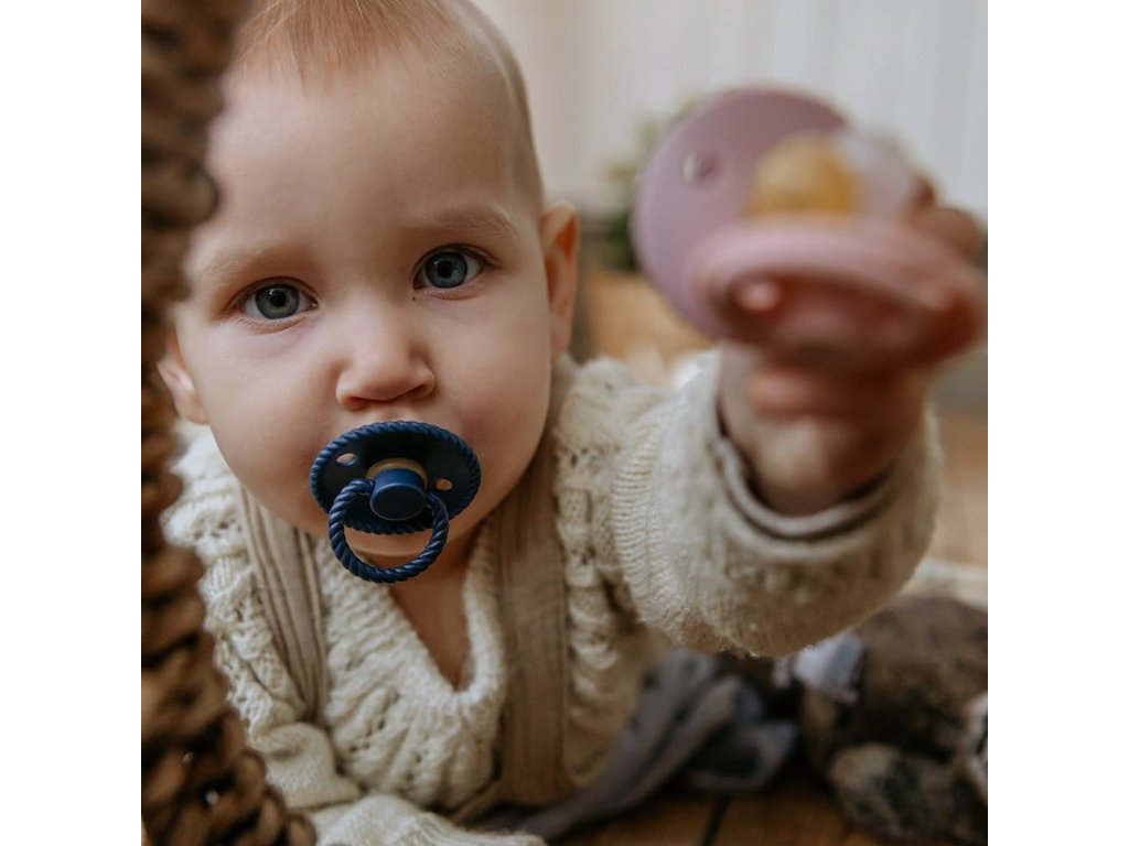 Okrúhly kaučukový cumlík, vhodný pre deti vo veku 6-18 mesiacov, so vzorom lana.