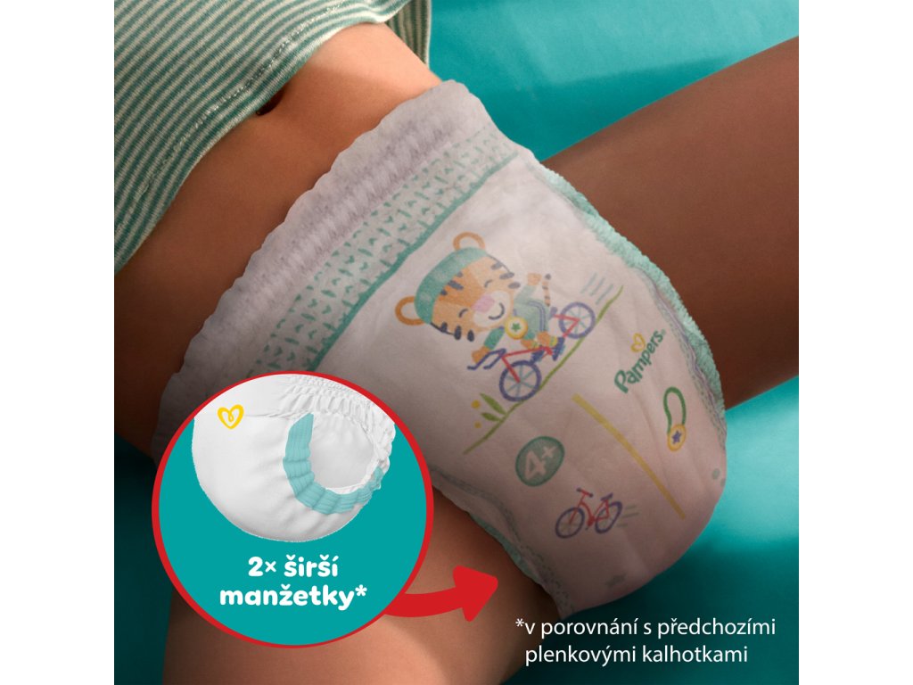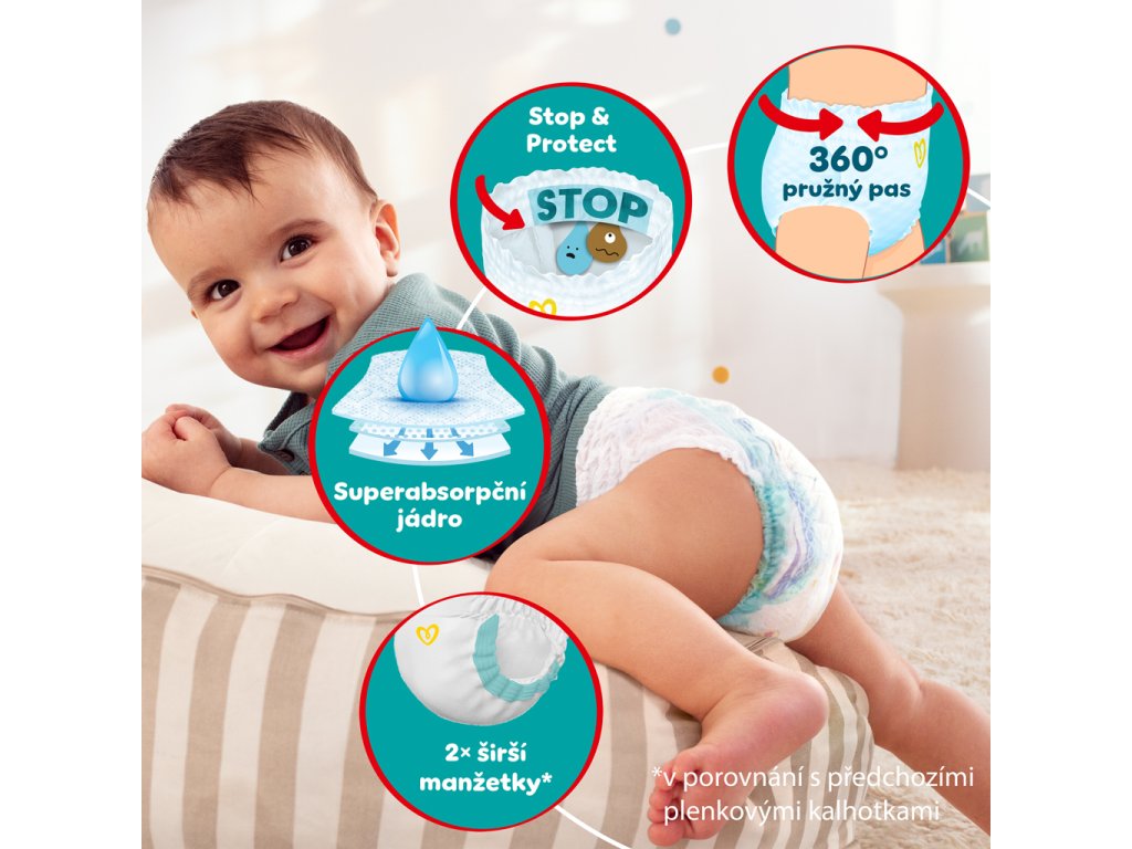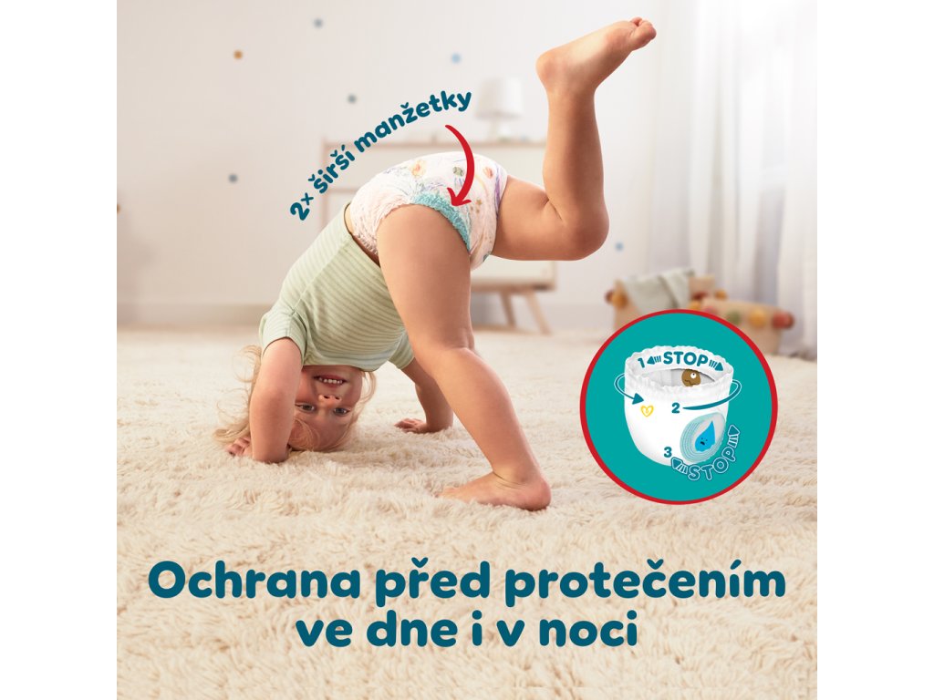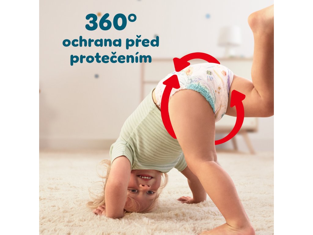 Akonáhle začne byť vaše dieťatko aktívnejšie, budete potrebovať takú plienku, ktorá mu pohodlne padne a dokáže ich spoľahlivo chrániť pri každom pohybe. Doprajte svojmu dieťatku najlepšie pohodlie a ochranu pred pretečením od Pampers s plienkovými nohavičkami Pampers Premium Care Pants: ich 2× širšie hebké manžetky chránia pred začervenaním a pretečením, ich ultra hebký pružný pás 360° FIT sa prispôsobuje pohybom vášho dieťatka pri vzadu.