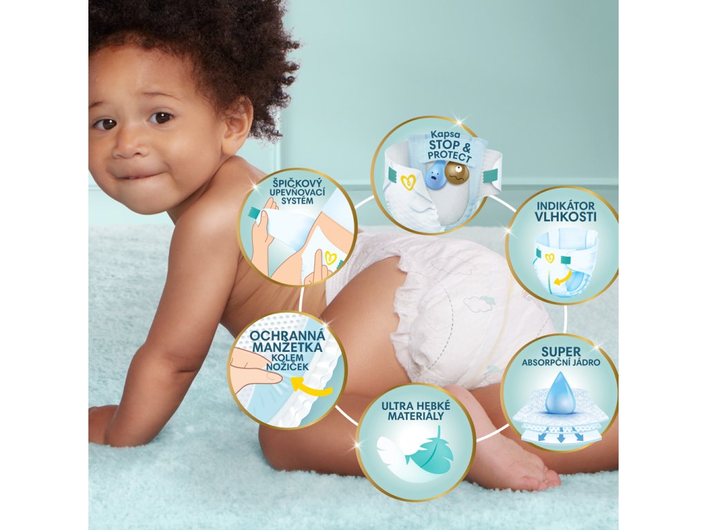 Dvojitá ochrana pre pokožku a pred pretečením. Najlepšie pohodlie a ochrana pre citlivú pokožku od Pampers - testované a schválené dieťatkami. Plienky č. 1 od Pampers navrhnuté špeciálne pre citlivú pokožku dieťatiek. A sú tiež našou jednotkou v ochrane pred pretečením.