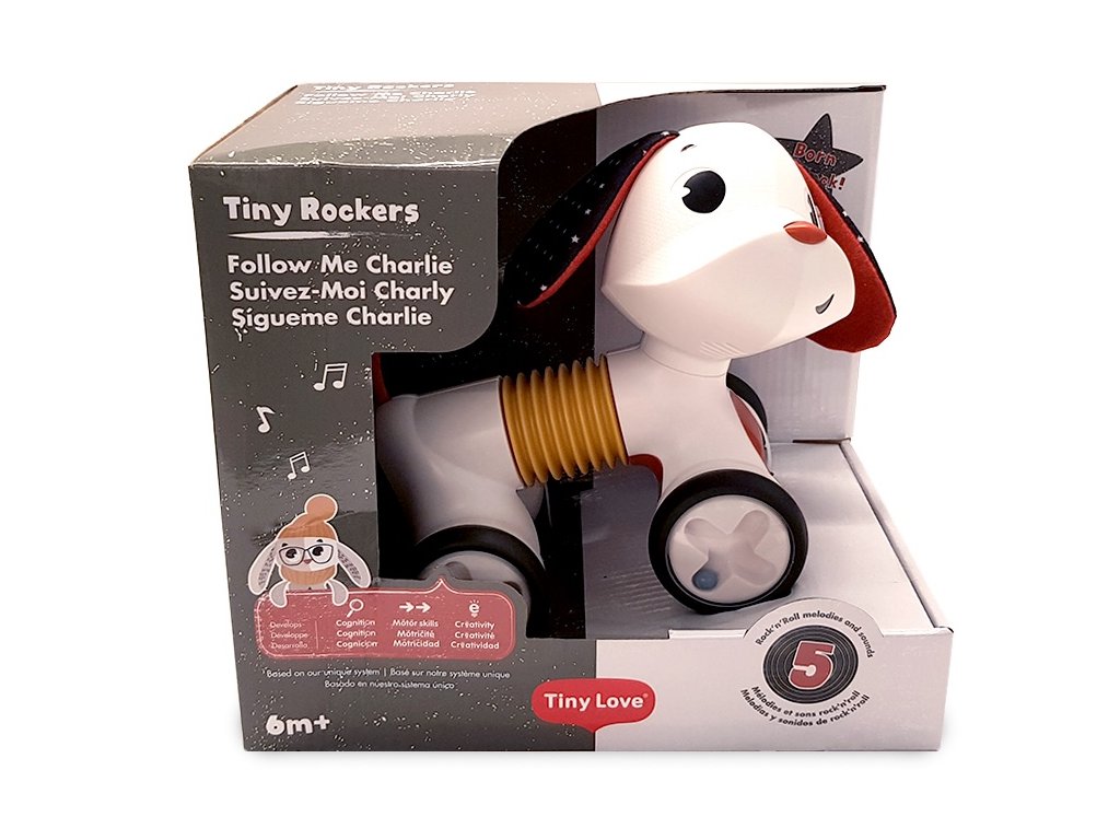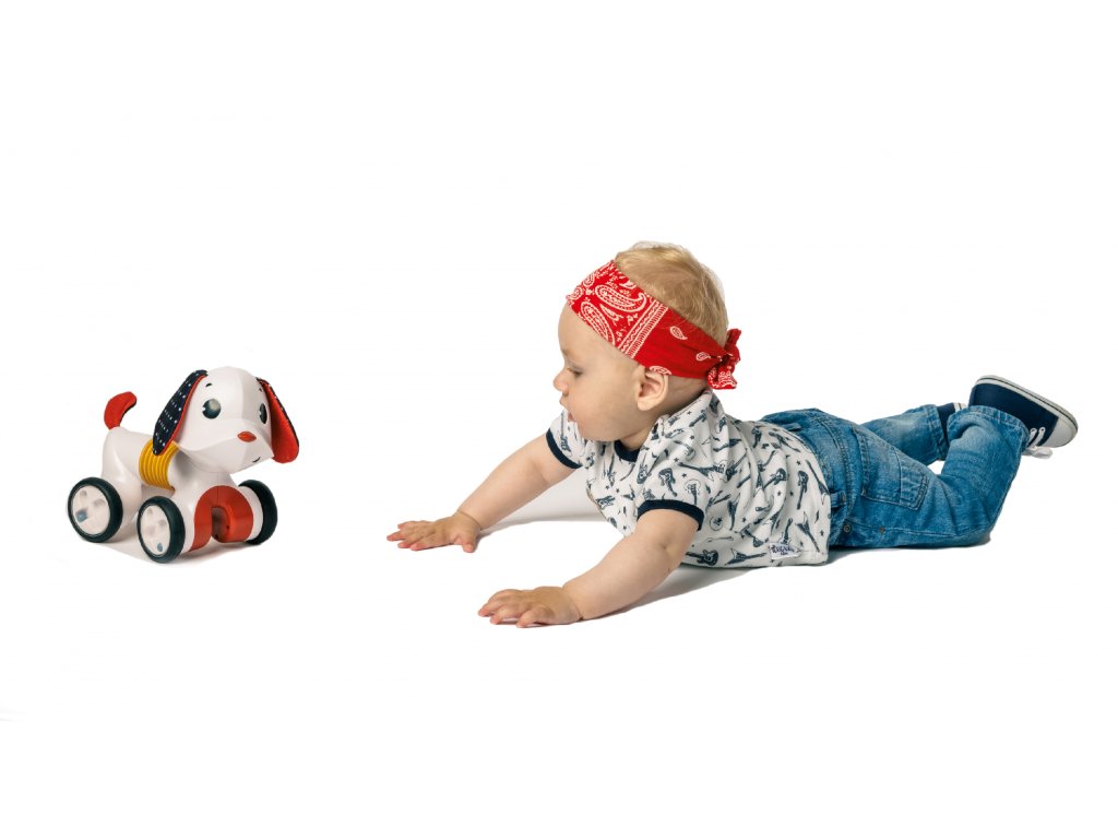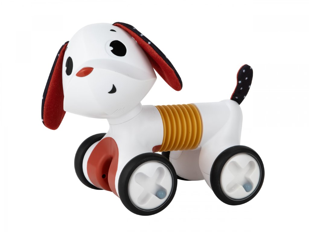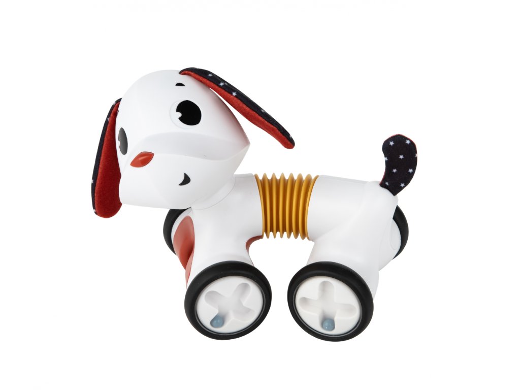 Rozkošná hudobná hračka v podobe psíka s naťahovacím harmonikovým telom a kolieskami zabaví dieťa od hrania na brušku cez lezenie a samostatné sedenie až po prvé krôčiky. Stlačením hlavy sa psík rozbehne, vie aj štekať a hrať 5 melódií.Vďaka ohybnému telu vie sedieť aj pri jazde zatáčať. Jeho hlavou s šuštiacimi ušami je možné otáčať.
