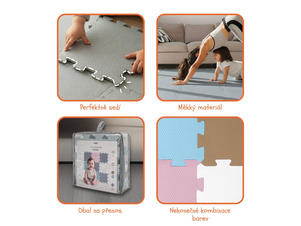 Jednotlivé dlaždice 30 × 30 cm (9 ks) do seba perfektne zapadajú. Podložka je vhodná pre deti od narodenia, vyrobená z nezávadného a príjemného materiálu.