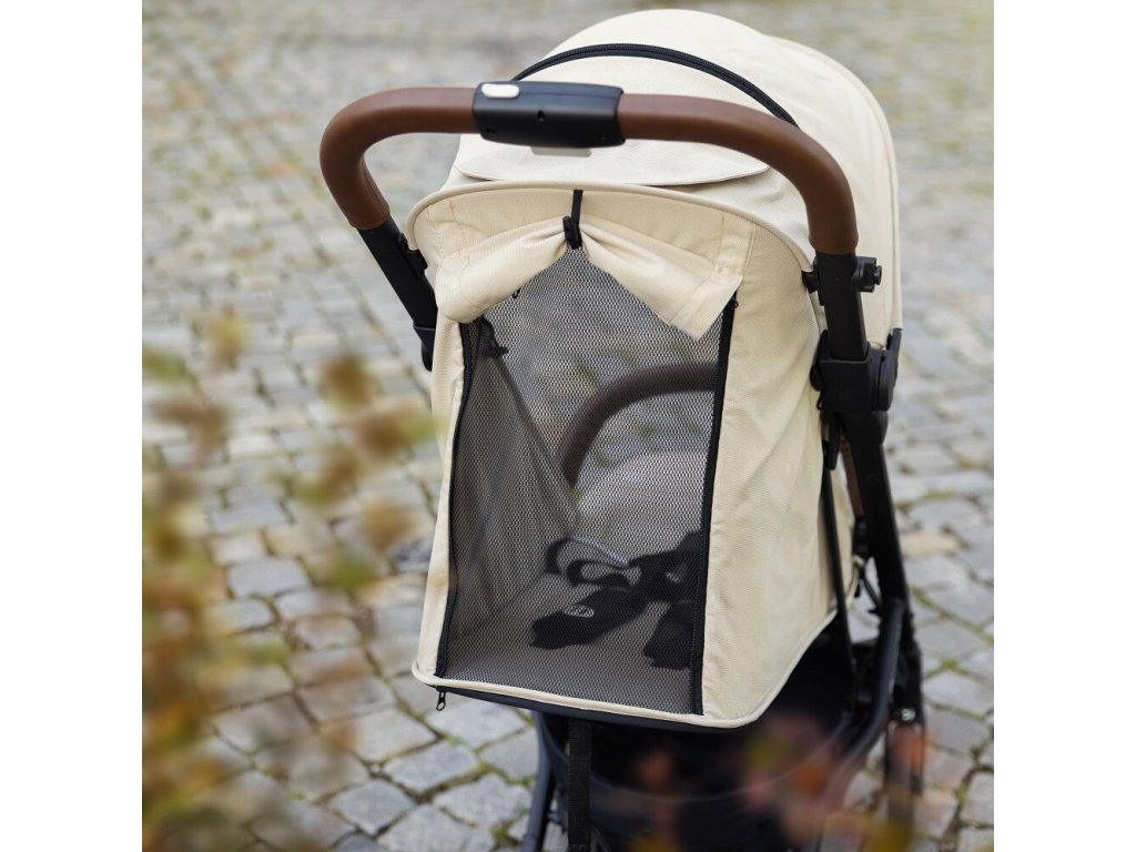 - Odvetranie zadnej strany kočíka – možnosť vyrolovania poťahu a odhalenie sieťky v zadnej časti chrbtovej opierky