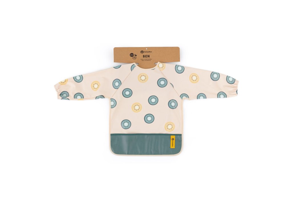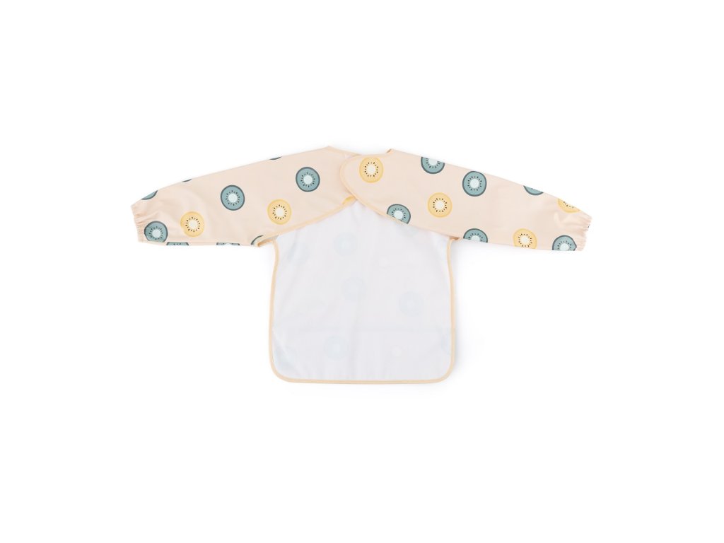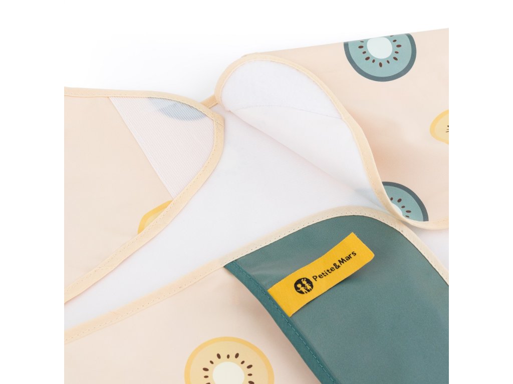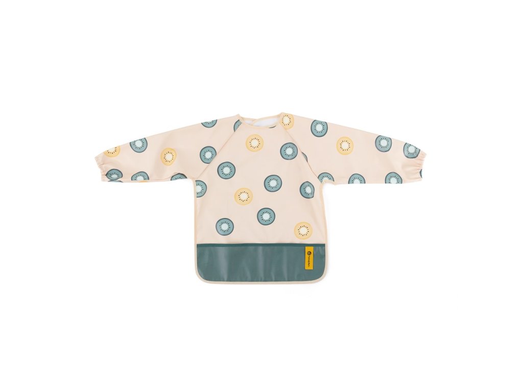 Pohodlný, nepremokavý podbradník s dlhým rukávom je vyrobený z rýchloschnúceho, bezpečného PU materiálu, úplne bez PVC a ftalátov. Predné vrecko na omrvinky zabezpečí poriadok a pohodlie pri kŕmení a dlhé rukávy s gumičkou chránia oblečenie pred zašpinením a namočením. Podbradník je veľmi jemný na dotyk a zapína sa na mäkký suchý zips. Možno ho používať nielen pri jedle, ale aj pri výtvarných prácach. Ak ho chcete udržať v čistote, po použití ho jednoducho utrite vlhkou handričkou.
