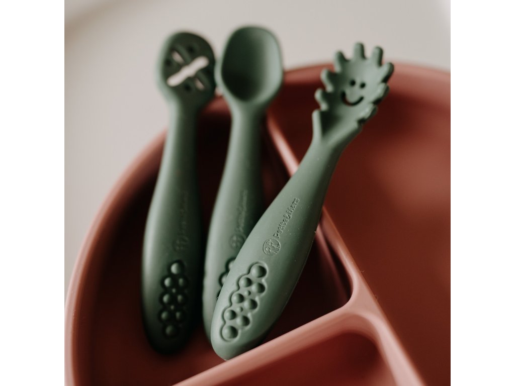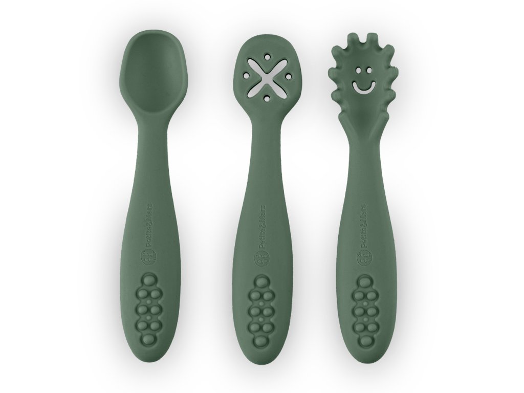 PETITE&MARS Set 3 ks silikónových tréningových lyžičiek Take&Match Misty Green 6m+