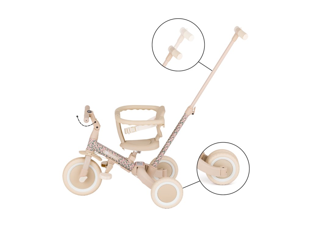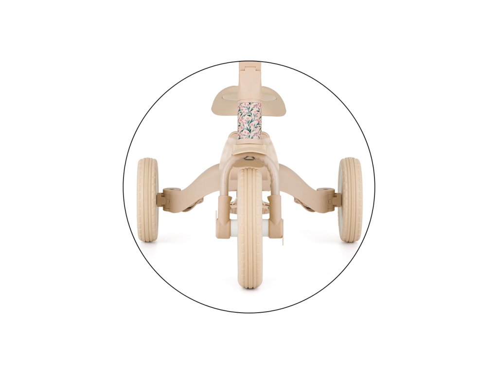 Multifunkčná trojkolka určená pre deti od 1,5 do 5 rokov alebo do 25 kilogramov je nielen dopravný prostriedok na presun a učenie sa rovnováhy, ale aj spoločník pre rastúce dieťa počas mnohých vývojových fáz. Vďaka premyslenej transformácii sa prispôsobí aktuálnym motorickým schopnostiam dieťatka – od trojkolky s asistenciou rodiča až po plnohodnotný bicykel s pedálmi.