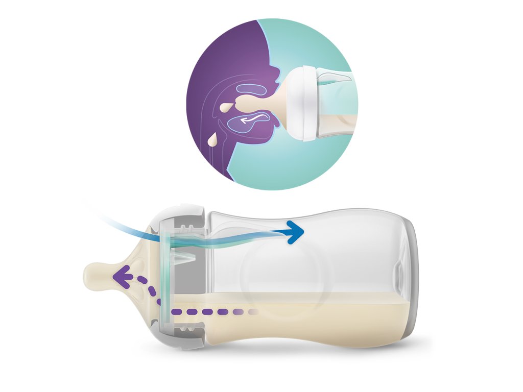 - Ventil AirFree - navrhnutý na dodatočnú ochranu pred kolikou, nadúvaním a refluxom vďaka cumlíku, ktorý zostáva plný mlieka, nie vzduchu, a uľahčuje kŕmenie vo vzpriamenej polohe s menším množstvom vzduchu.