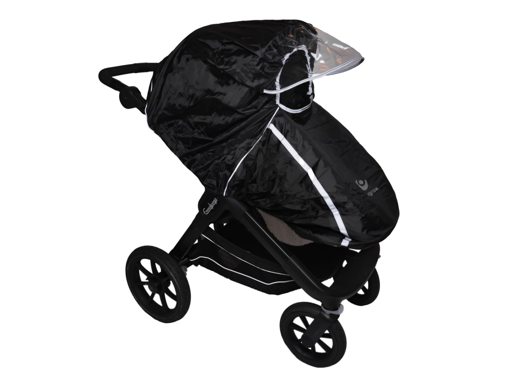 Univerzální pláštěnka na kočárek je praktická ochrana proti dešti a větru, vhodná na většinu typů kočárků. Průhledná přední clona chrání dítě a zároveň nechává dovnitř kočárku proudit světlo a umožňuje výhled z kočárku. Velký přední otvor zajišťuje příjemné proudění vzduchu. Pláštěnka má boční zip, díky kterému ji snadno otevřete a rychle sundáte i mokrou, a to s minimálním hlukem. Pro bezpečnější pohyb za šera je doplněná reflexními prvky. Po použití ji snadno složíte do integrované kapsy.