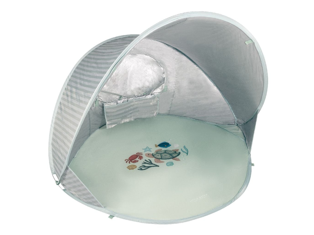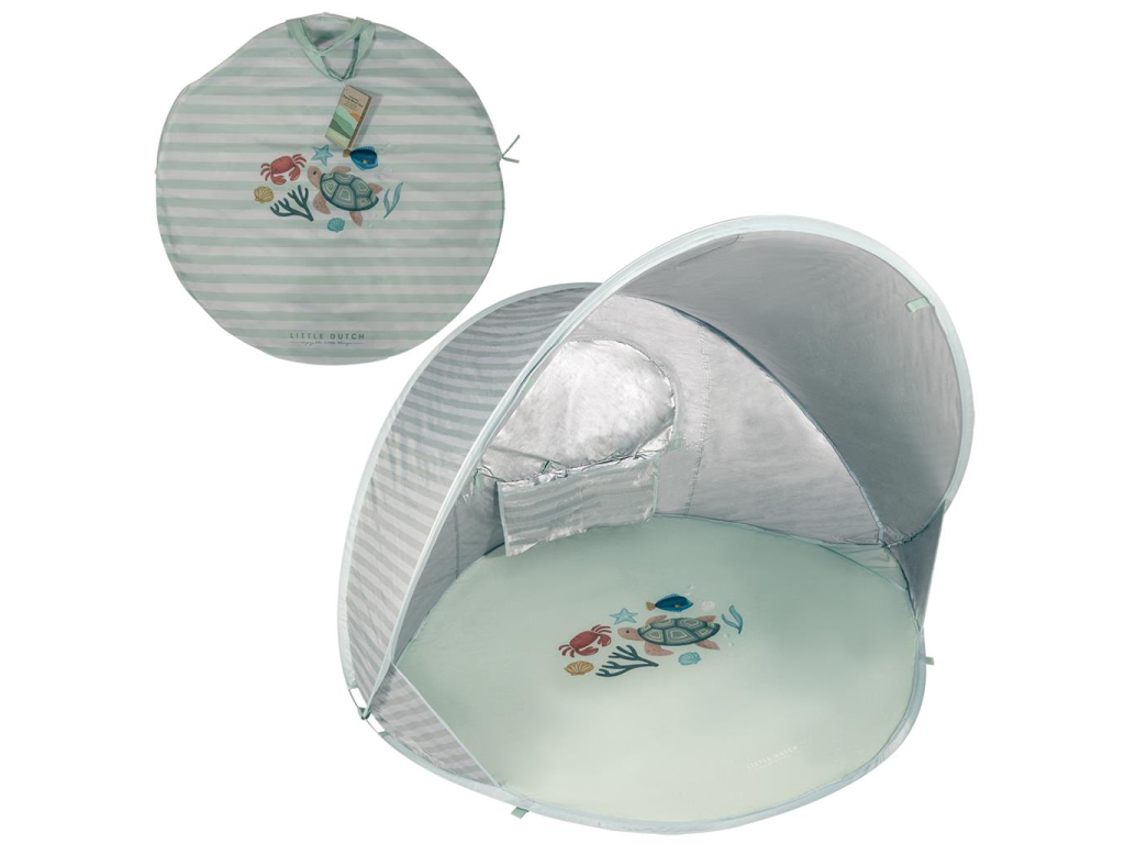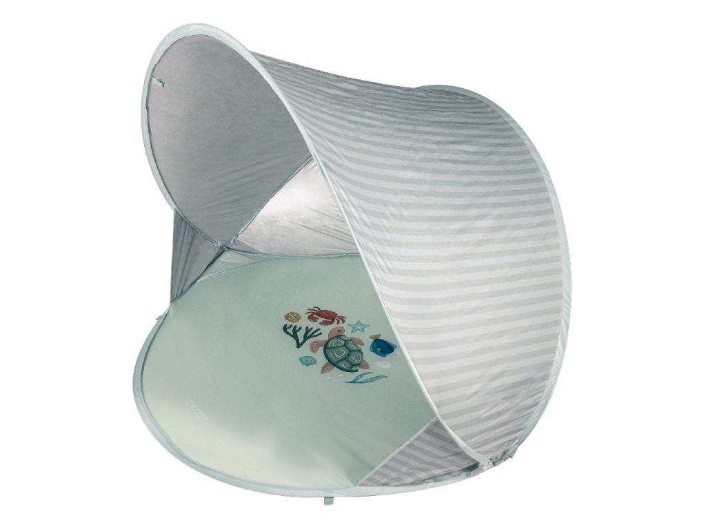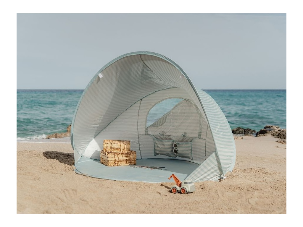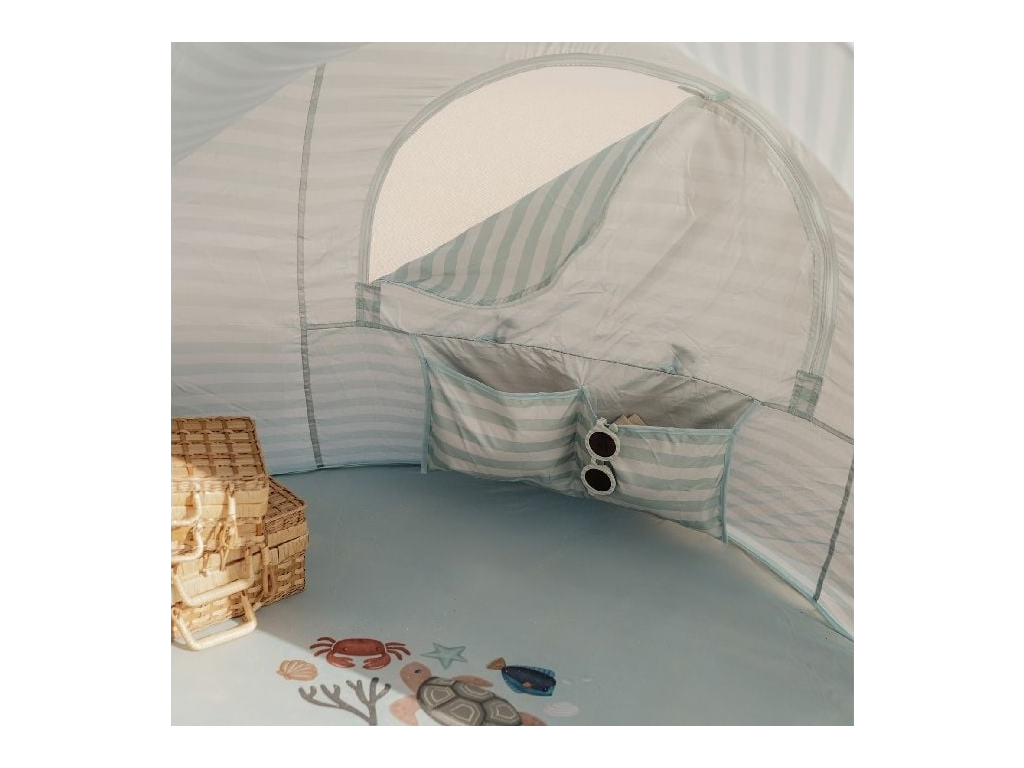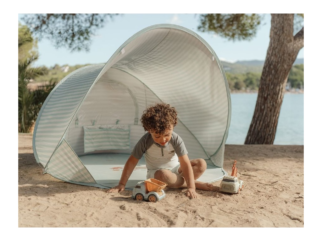Přenosný skládací stan s UV faktorem 40+ pro ochranu dítěte před sluncem na zahradě, na pláži či na výletech do přírody. Stan umožňuje snadnou ventilaci díky zadnímu okénku na zip. Dvě kapsy na vnitřní stěně nabízí prostor pro uložení drobností.
