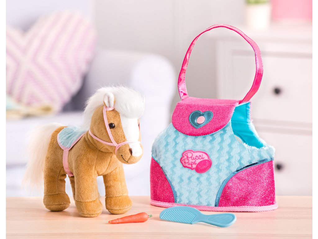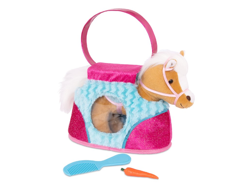 Nádherný plyšový poník v taške s krásnou potlačou je vždy pripravený na maznanie aj na prechádzku. Miluje vyčesávanie svojej hebkej hrivy hrebienkom a vďaka taške si ho vaše dieťa môže vziať kamkoľvek. Taška má postranné otvory, aby poník pri prenášaní videl na svet.