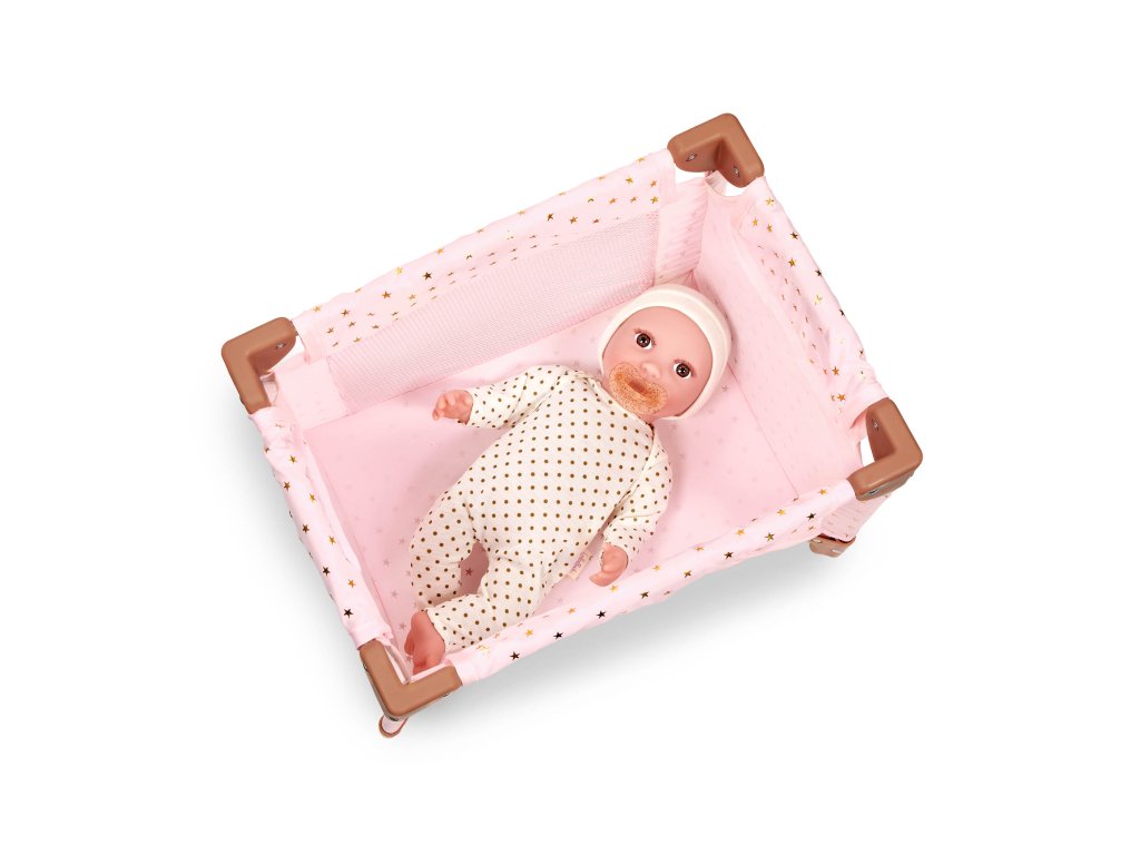 Doprajte bábike vášho dieťaťa krásne miesto na snívanie aj hranie s touto štýlovou postieľkou LullaBaby. Jemné ružové prevedenie so zlatými hviezdičkami zapadne do každej detskej izbičky. Postieľka je stabilná a odolná pre každodennú hru, zároveň sa ale ľahko zloží naplocho pre praktické uloženie alebo cestovanie. Súčasťou balenia je sada doplnkov – kačička do kúpeľa, krabička s obrúskami, hryzátko, hrnček a stohovacia hračka.