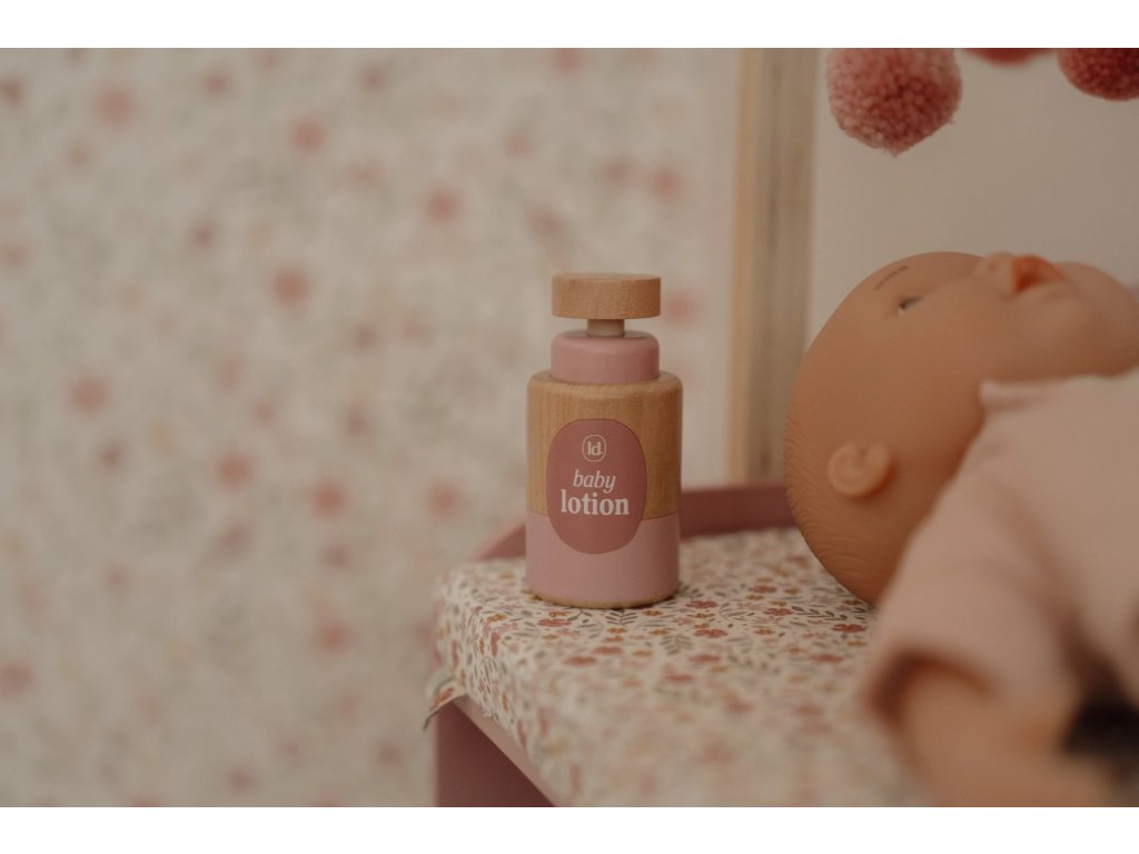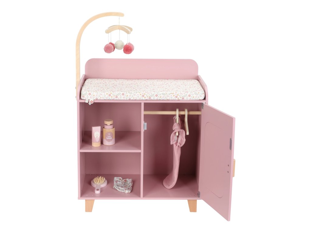 Elegantný prebaľovací pult Little Dutch umožňuje deťom napodobňovať každodennú starostlivosť o bábätko a starať sa o bábiky rovnako, ako sa mamička či otec starajú o svoje bábätko. Súčasťou balenia je mäkká prebaľovacia podložka s romantickou kvetinovou potlačou, závesný kolotoč, spací vak, textilná plienka, dve ramienka a drevené doplnky pre starostlivosť o bábiku. Praktická skrinka a poličky v spodnej časti prebaľovacieho pultu umožňujú mať všetko potrebné pre starostlivosť o bábiku vždy po ruke a upratané.