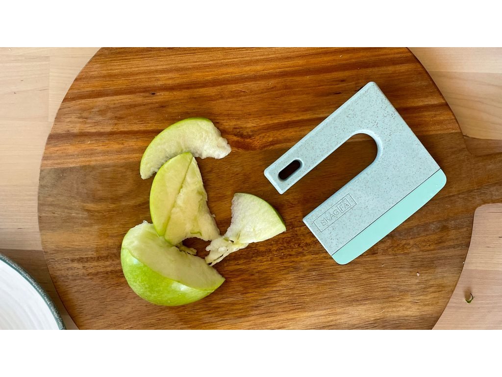 KLYV je navrhnutý špeciálne pre malé rúčky, ktoré sa chcú zapojiť do varenia a majú veľkú chuť pomáhať. Vďaka jedinečnému klinovému tvaru a čepeli z nehrdzavejúcej ocele bez ostrých hrán môžu deti bezpečne, samostatne (ale vždy pod dohľadom dospelého!) a s radosťou krájať ovocie, zeleninu a iné dobroty bez rizika poranenia.