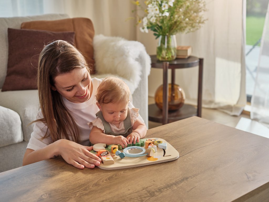 Drevený pult s aktivitami Tiny Love je hračka plná pohyblivých prvkov, ktorá podporuje objavovanie, sústredenie aj prvé logické uvažovanie. Pult je navrhnutý tak, aby rástol s dieťaťom: hodí sa pre hru na brušku, v sede aj v stoji, a je tak využiteľný v rôznych vývojových fázach dieťaťa.