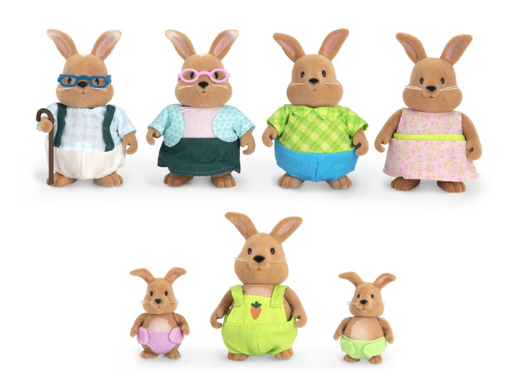 Sada obsahuje 7 postavičiek králikov. Ďalšie postavičky zvieratiek, domčeky, obchody, dopravné prostriedky a pod. sa predávajú samostatne. Všetky postavičky a doplnky Li'l Woodzeez sú navzájom kompatabilné a umožnia vám vytvoriť originálne mestečko pre nekonečnú hru rozvíjajúcu fantáziu a kreativitu vášho dieťaťa.