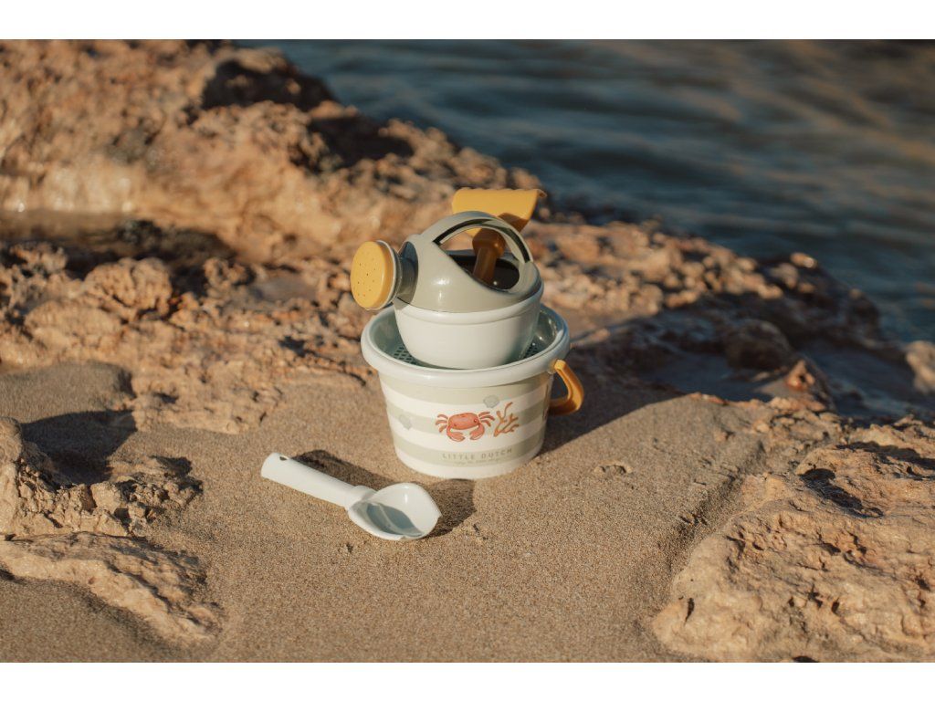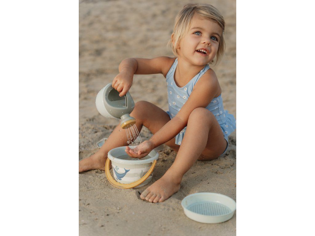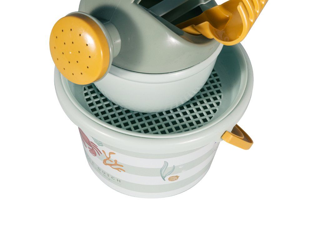 Sada na piesok s krásnou potlačou motívov zo života pod morskou hladinou sa bude deťom hodiť doma na záhrade aj pri mori na pláži. Sadu tvorí vedierko, kanvička, hrabličky, lopatka a sitko v kvalitnom prevedení z pevného plastu.