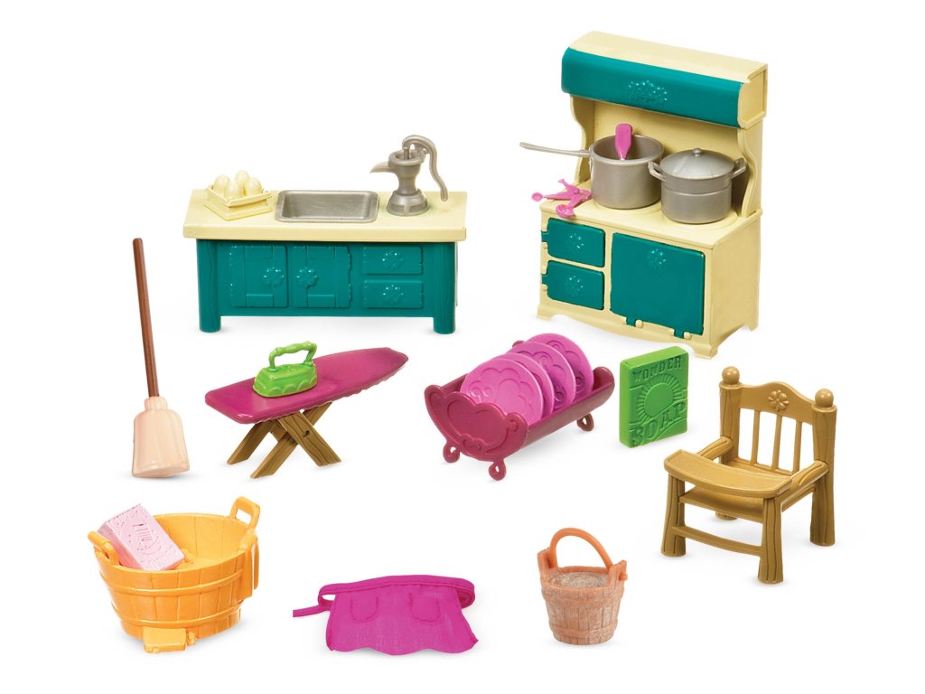 Sada nábytku vám umožní vybaviť kuchyňu v domčeku pre postavičky zvieratiek Li'l Woodzeez. Po dobrej večeri je potrebné umyť riad, umyť podlahu a vyžehliť vypranú bielizeň! Domček aj postavičky zvieratiek sa predávajú samostatne.