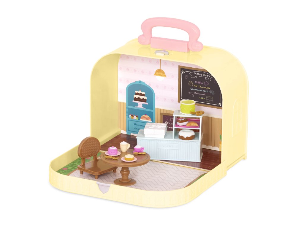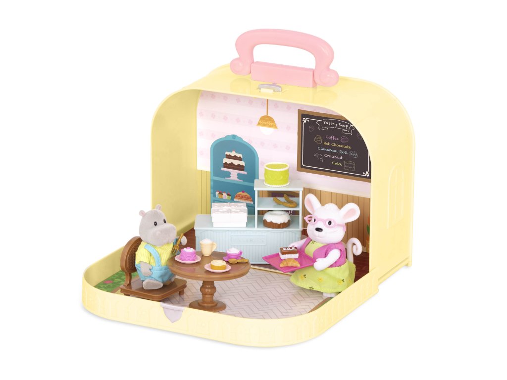 Cestovná sada hračiek Li'l Woodzeeze v praktickom kufríku umožní vášmu dieťaťu hrať sa kdekoľvek na dovolenke, výletoch či počas víkendu u starých rodičov. Kufrík sa po otvorení premení na bohato vybavenú cukráreň s nábytkom a doplnkami.