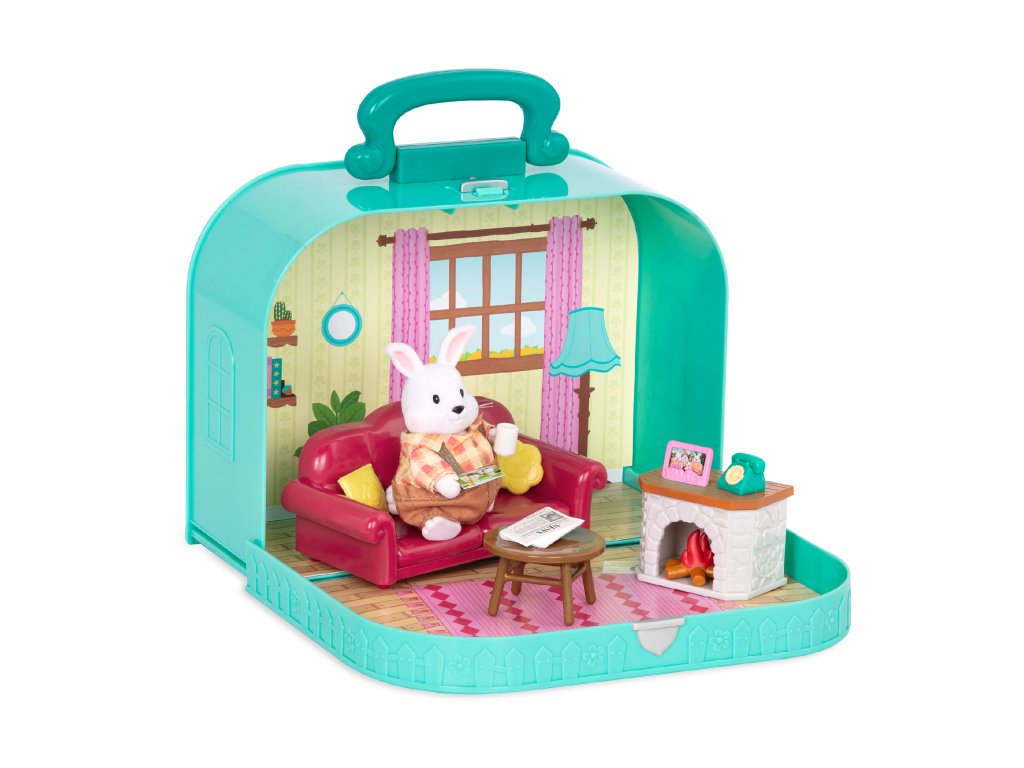 Cestovná sada hračiek Li'l Woodzeeze v praktickom kufríku umožní vášmu dieťaťu hrať sa kdekoľvek na dovolenke, výletoch či počas víkendu u starých rodičov. Kufrík sa po otvorení premení na bohato vybavenú obývaciu izbu s nábytkom a doplnkami.