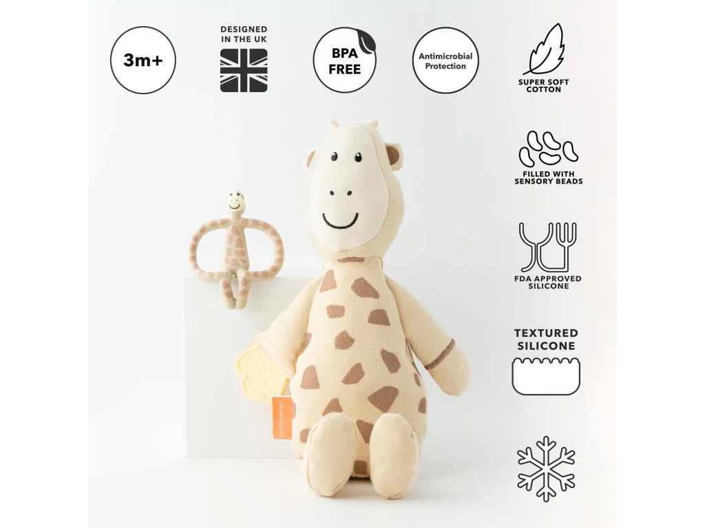 Darujte novým rodičom obľúbené hryzadlo MATCHSTICK MONKEY v tvare žirafky spolu s mäkkou plyšovou žirafkou v rovnakom dizajne.
