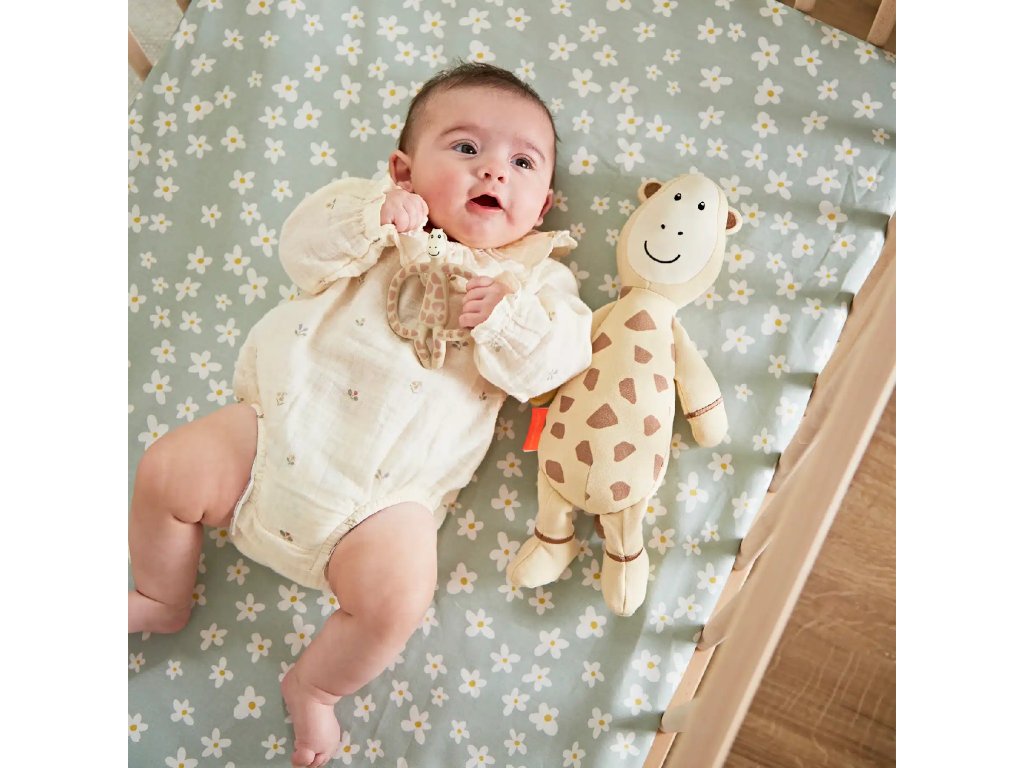 Mäkká bavlnená plyšová žirafka je šetrná k detskej pokožke a vo vnútri má senzorické guličky, ktoré stimulujú zmysly. Obsahuje hryzadlovú ruku na masáž ďasien a šuštiace nožičky pre sluchovú a hmatovú stimuláciu – ideálny kamarát na upokojenie. Pre jednoduchú údržbu je možné ju prať v práčke.
