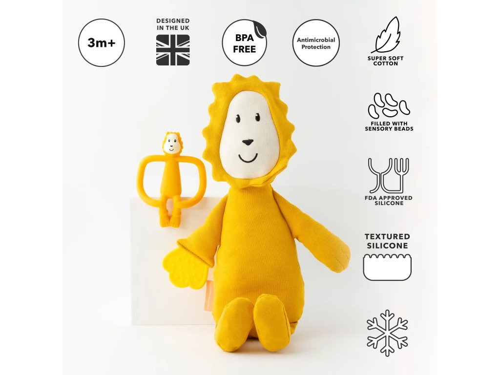 Darujte novým rodičom obľúbené hryzadlo MATCHSTICK MONKEY v tvare levíka spolu s mäkkým plyšovým levíkom v rovnakom dizajne.