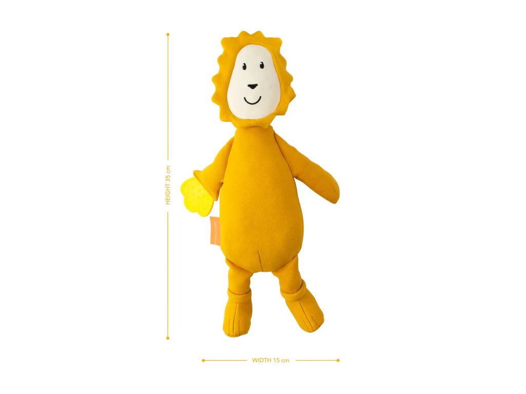 Mäkký bavlnený plyšový levík je šetrný k detskej pokožke a vo vnútri má senzorické guličky, ktoré stimulujú zmysly. Obsahuje hryzadlovú ruku na masáž ďasien a šuštiace nožičky pre sluchovú a hmatovú stimuláciu – ideálny kamarát na upokojenie. Pre jednoduchú údržbu je možné ju prať v práčke.