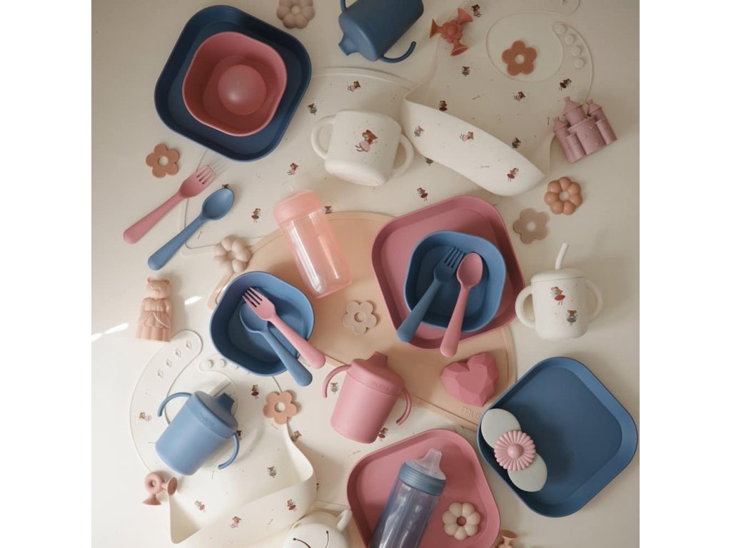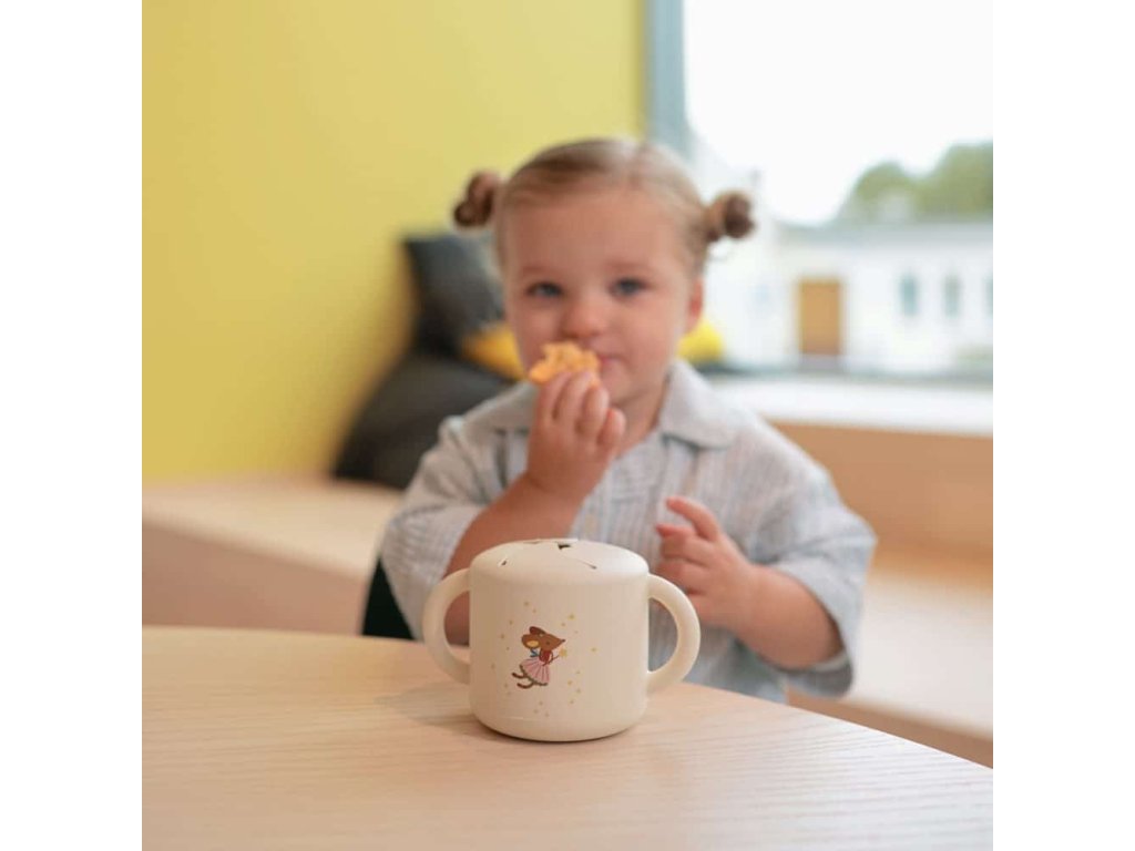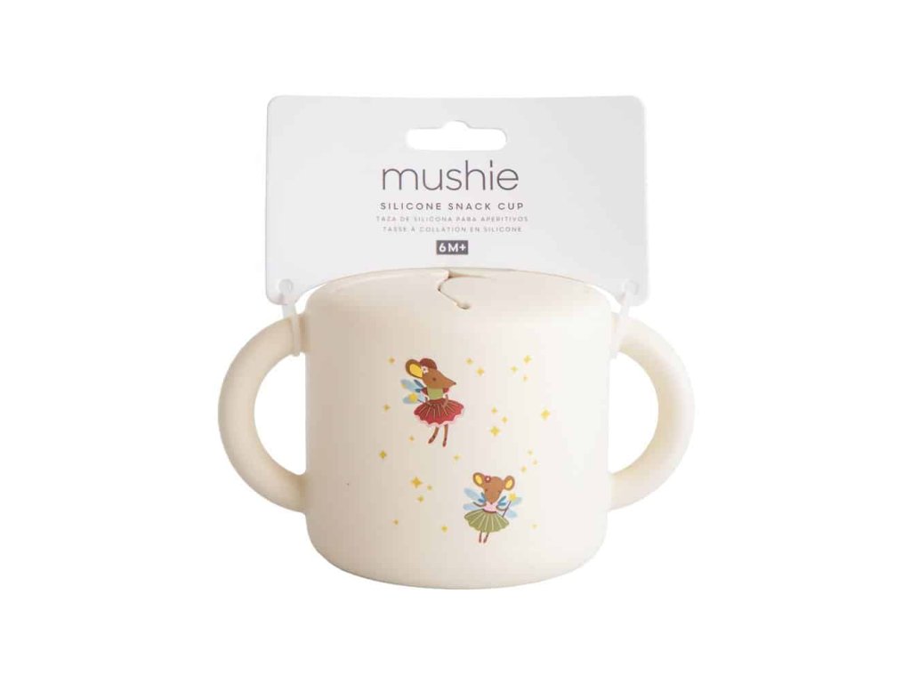 Mushie snack pohárik v jemnej farbe s krásnym dizajnom Fairy Mice.