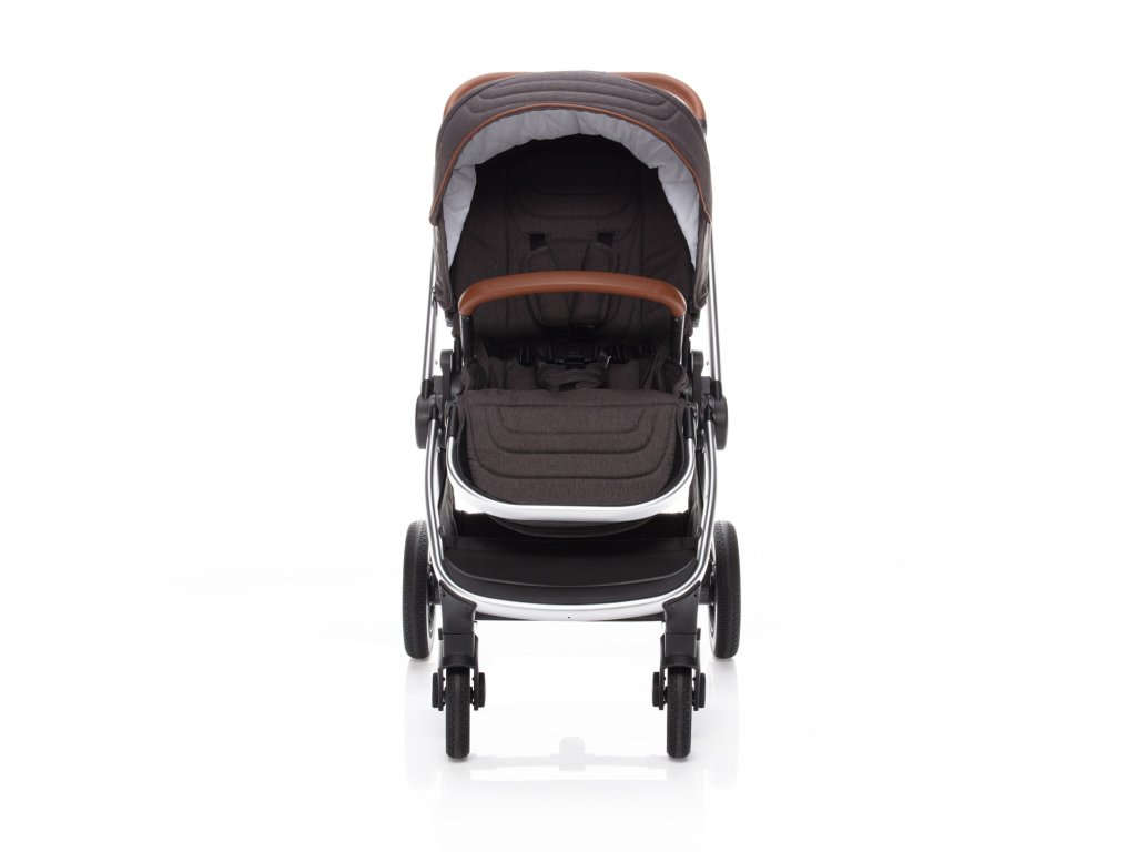 Ak ste vyššieho vzrastu, u kočíku iste oceníte výškovo nastaviteľnú rukoväť, ktorá je, rovnako ako hrazda, vyrobená z eko-kože. Čo tiež podčiarkuje moderný dizajn kočíka. Pre ľahšiu manipuláciu môžete hrazdu šikovne odopnúť a odkloniť na stranu. Tým si uľahčíte vkladanie dieťaťa do kočíka, kde ho bezpečne pripútate 5bodovým bezpečnosťným pásom. Pre zaistenie kočíka samozrejme nechýba ani centrálna brzda.
