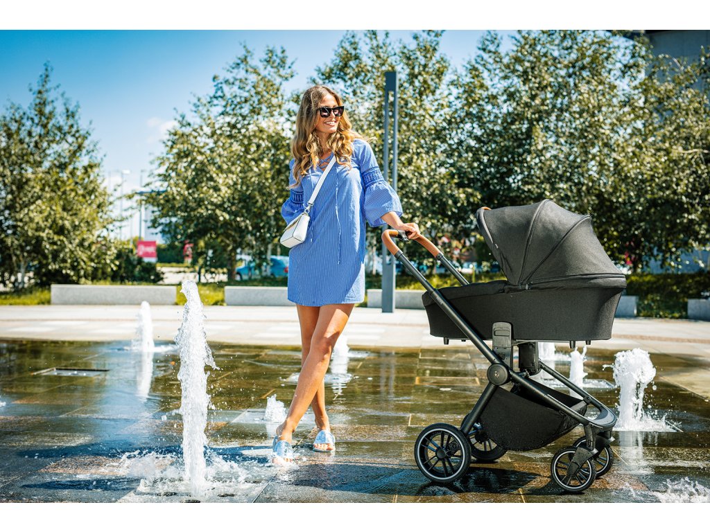 Ak ste vyššieho vzrastu, u kočíku iste oceníte výškovo nastaviteľnú rukoväť, ktorá je, rovnako ako hrazda, vyrobená z eko-kože. Čo tiež podčiarkuje moderný dizajn kočíka. Pre ľahšiu manipuláciu môžete hrazdu šikovne odopnúť a odkloniť na stranu. Tým si uľahčíte vkladanie dieťaťa do kočíka, kde ho bezpečne pripútate 5bodovým bezpečnosťným pásom. Pre zaistenie kočíka samozrejme nechýba ani centrálna brzda.