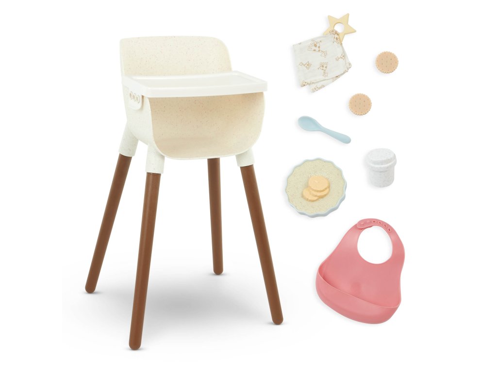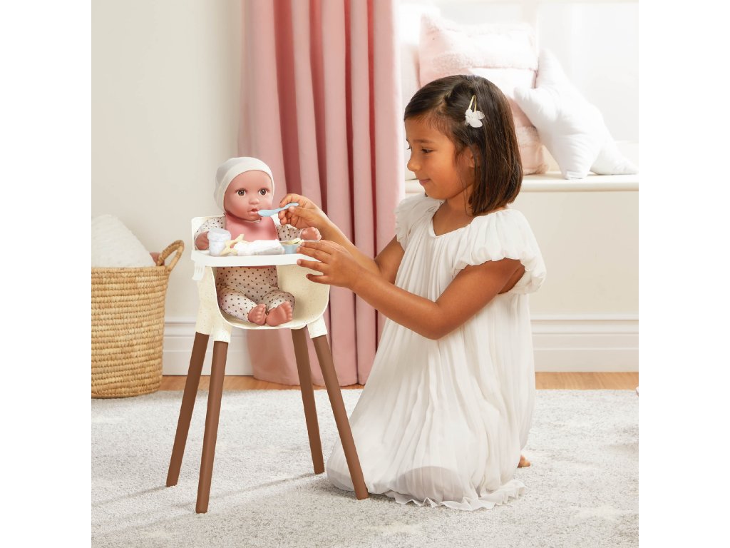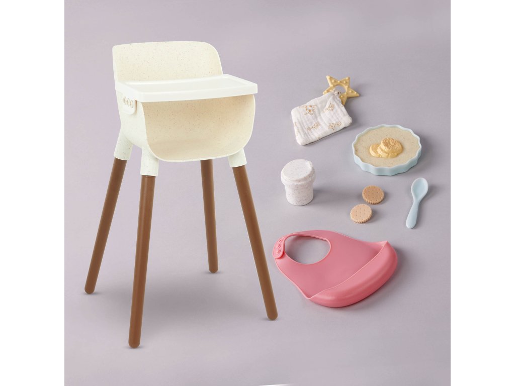Štýlová stolička s jedálenským pultom umožní vašim deťom pohodlne usadiť svoju bábiku a nakŕmiť ju pomocou bohatej sady doplnkov, ktorá obsahuje hrnček s odnímateľným viečkom, 2 sušienky, lyžičku, misku ovsenej kaše s banánmi, podbradník a hryzátko.