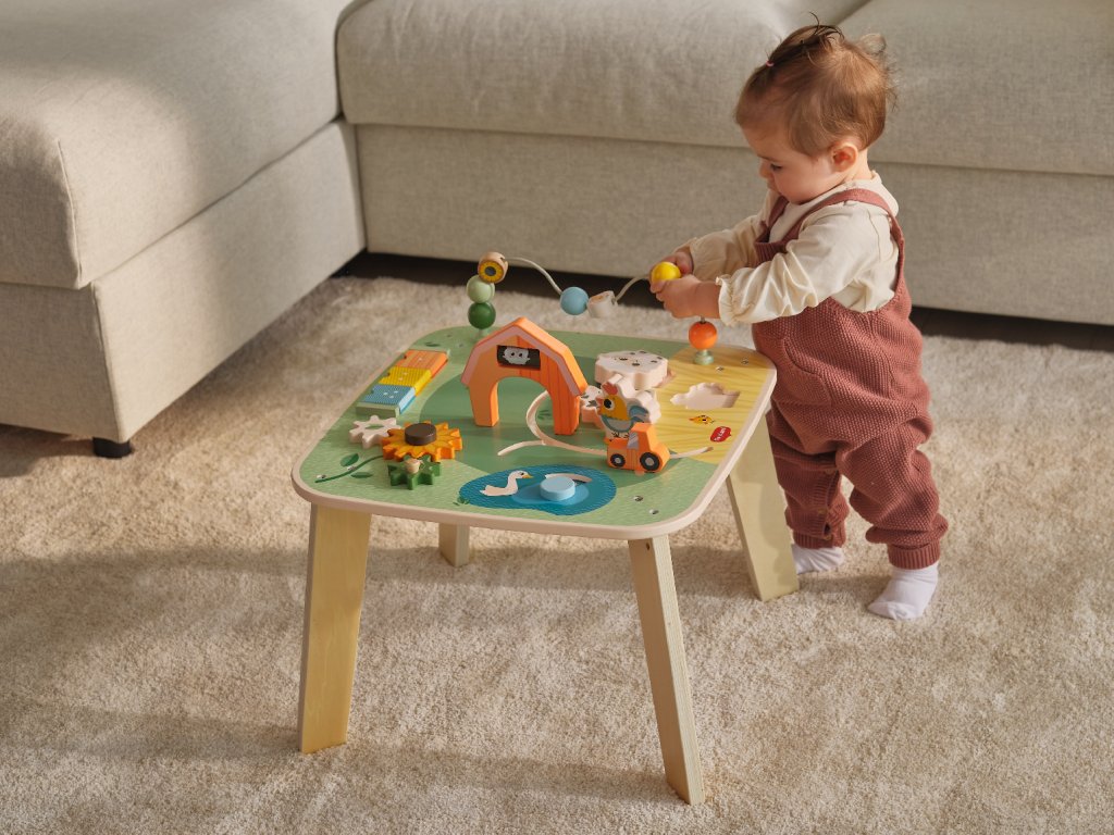 Drevený stolík s aktivitami Tiny Love je skvelá hračka pre malých objaviteľov, ktorá ponúka množstvo možností, ako sa hrať, skúmať a učiť sa. Na jednom mieste kombinuje rôzne pohyblivé prvky, vkladanie a skryté prekvapenia - dieťa si tak prirodzene trénuje jemnú motoriku, koordináciu ruka-oko, sústredenie aj prvé logické uvažovanie. Stolík s krásnymi motívmi zo života na farme podporuje samostatnú hru, ale zároveň je ideálny aj pre spoločné chvíle s rodičmi alebo súrodencami.
