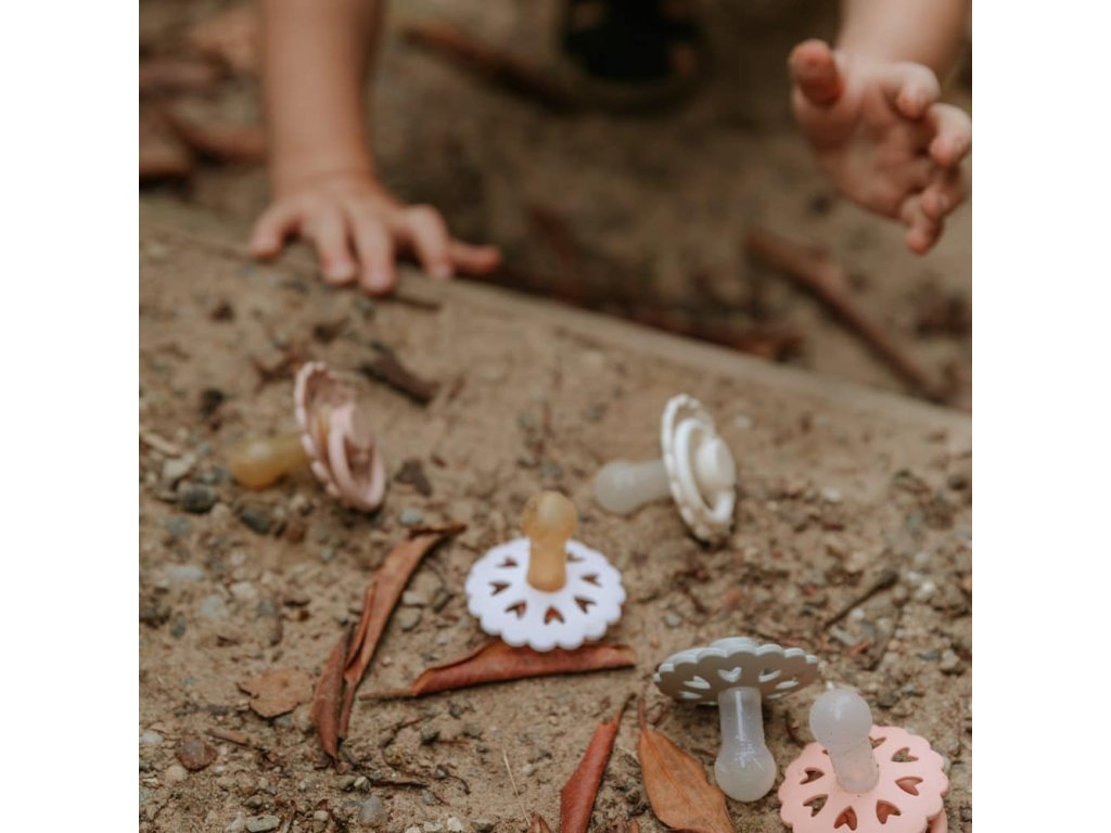- 1 ks okrúhly cumlík FRIGG Fairytale vo farbe: The Show Queen (White Lilac)