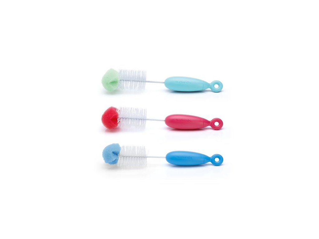DUO kefa obsahuje veľkú flexibilnú kefu s ergonomickým držadlom pre lepší úchop určenú na čistenie fliaš a vo vnútri držadlá schovanú malú kefku, ktorú vyčistíte všetky potrebné miesta nielen fľaštičiek, ale aj cumlíkov a náhradných cumlíkov.