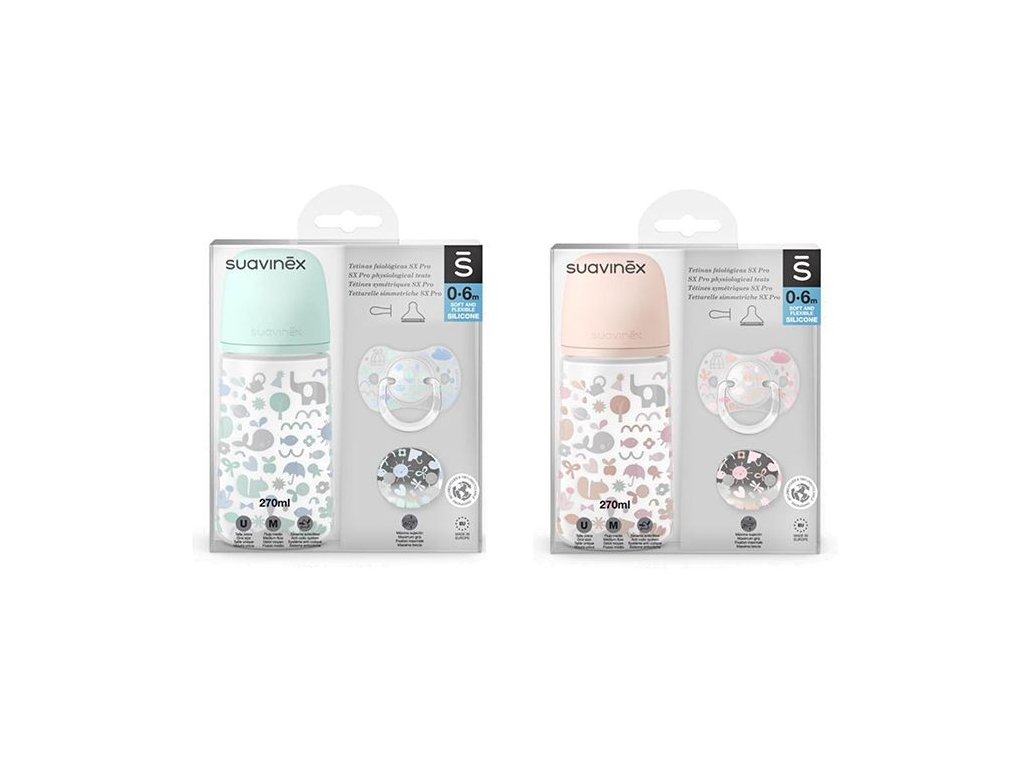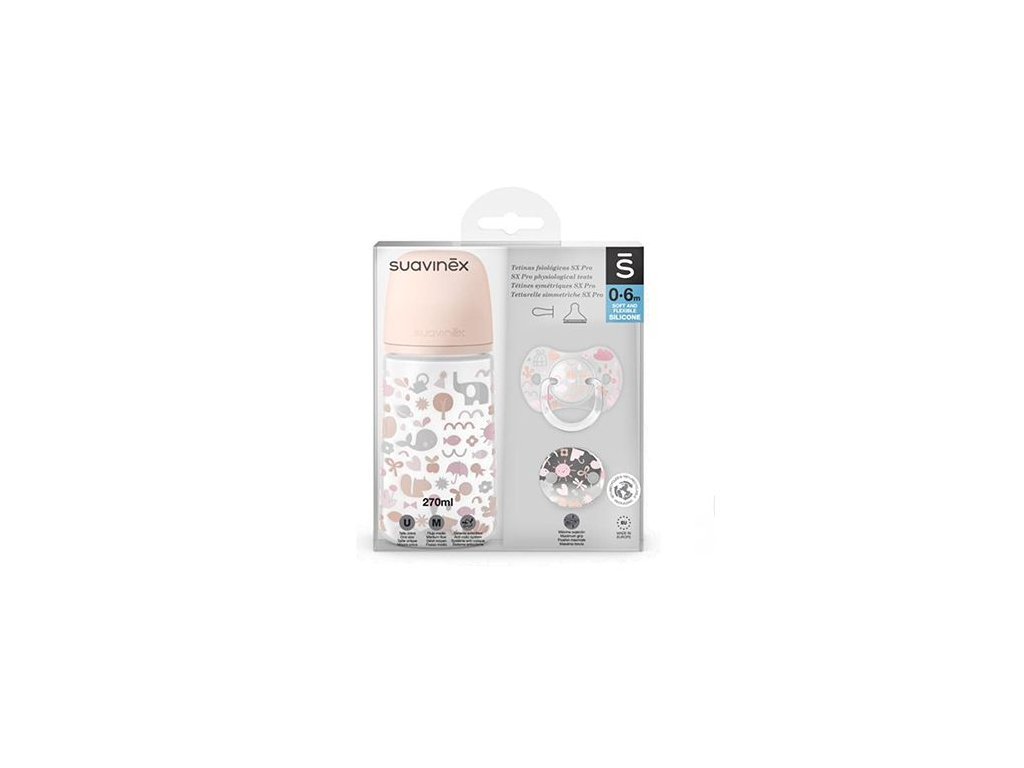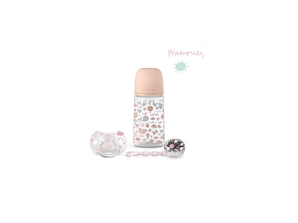 SUAVINEX | SADA FĽAŠA 270ml + cumlík fyziologický 0/6m + klip MEMORIES - ružová