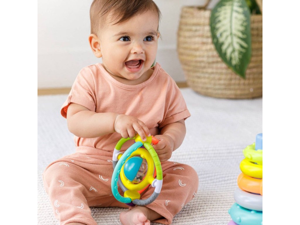 Hrkálka Orbit s rôznymi textúrami na skúmanie má tvar pre ľahké uchopenie rúk aj ústami. Korálky vo vnútri priehľadného krúžku pri pohybe jemne hrkajú.
