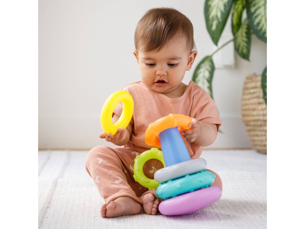 Pyramída je tvorená guľatou základňou a nasadzovacími krúžkami rôznych farieb, veľkostí i textúr. Dieťa sa snaží umiestniť krúžky v správnom poradí a vytvoriť z nich pyramídu. Vďaka guľatej základni sa hračka kýve do všetkých strán a nasadenie krúžkov bude pre dieťa celkom výzva!