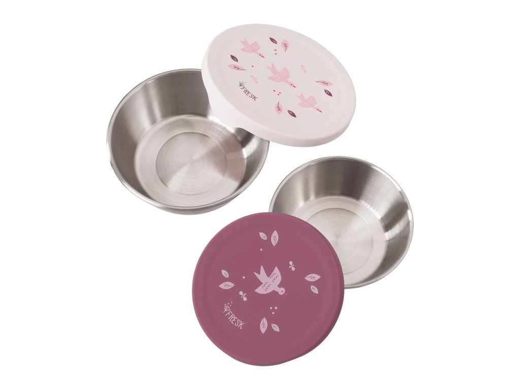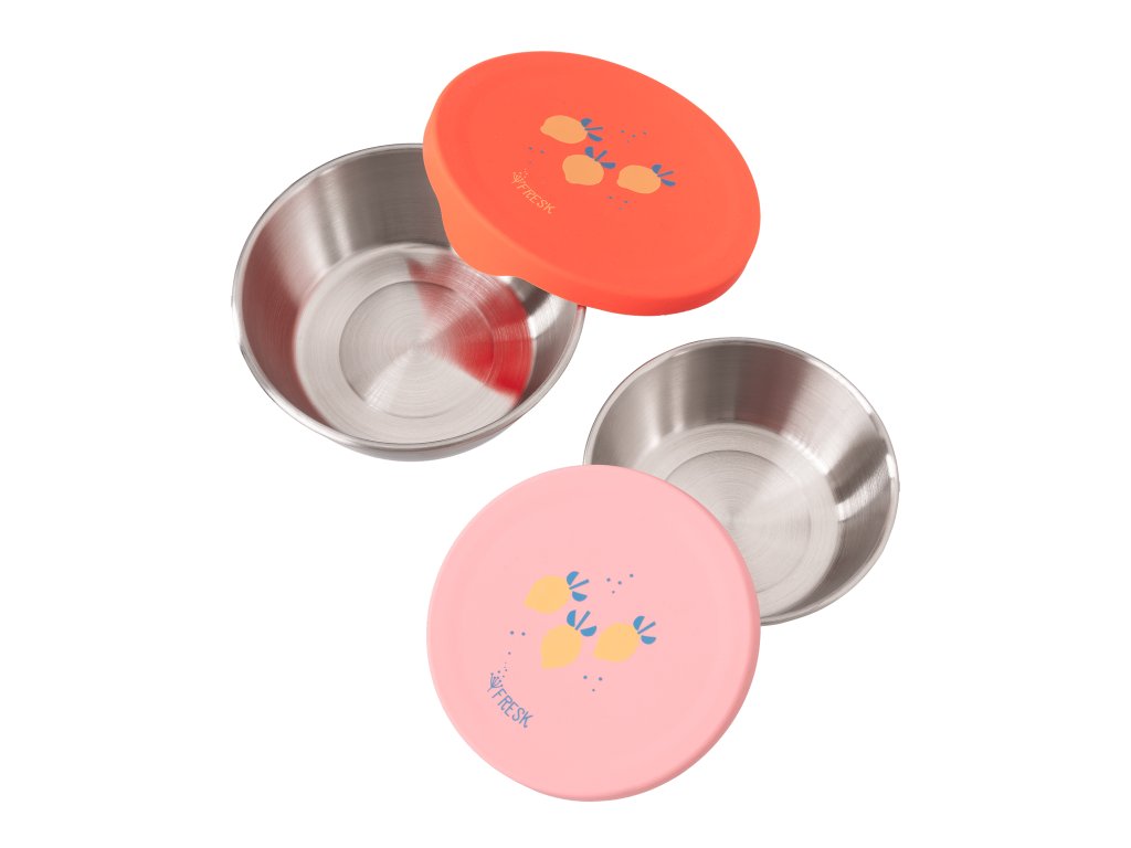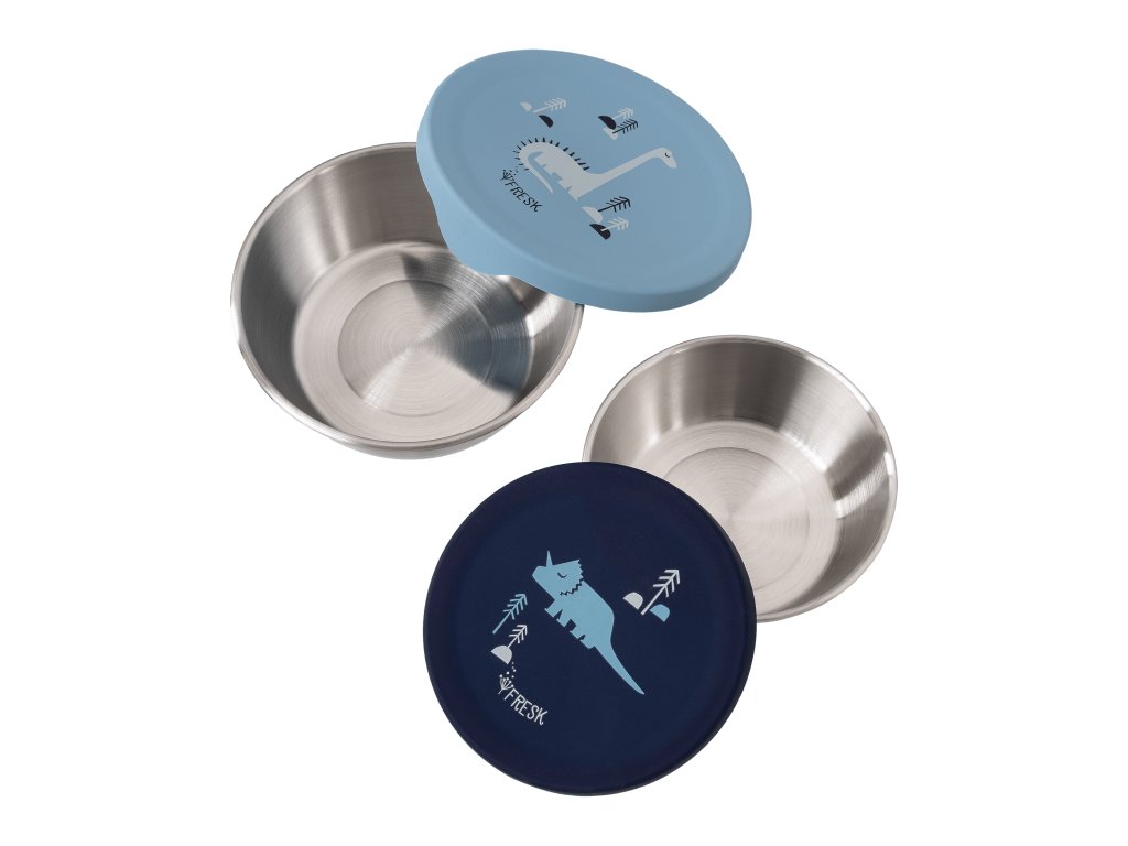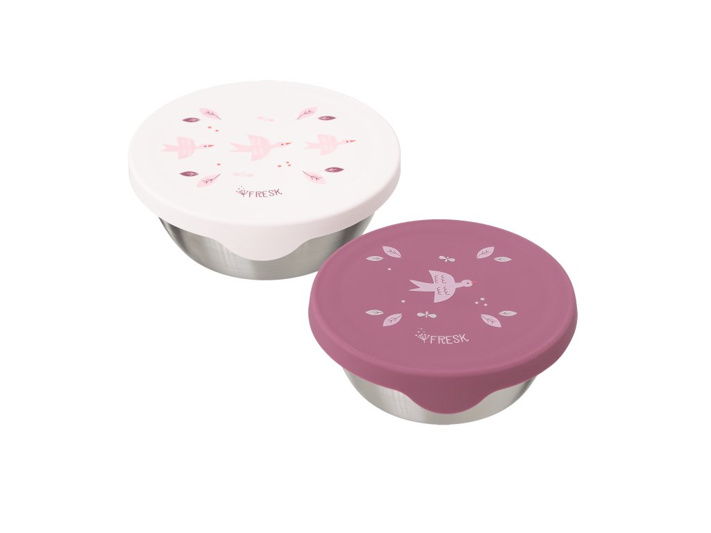 Dve dózy sú vyrobené z pevnej nehrdzavejúcej ocele a majú praktické silikónové viečka. Oceľové dno zabezpečuje, že nenaťahujú farbu ani vôňu z potravín, a flexibilné silikónové viečko ľahko otvoria aj malé detské rúčky.