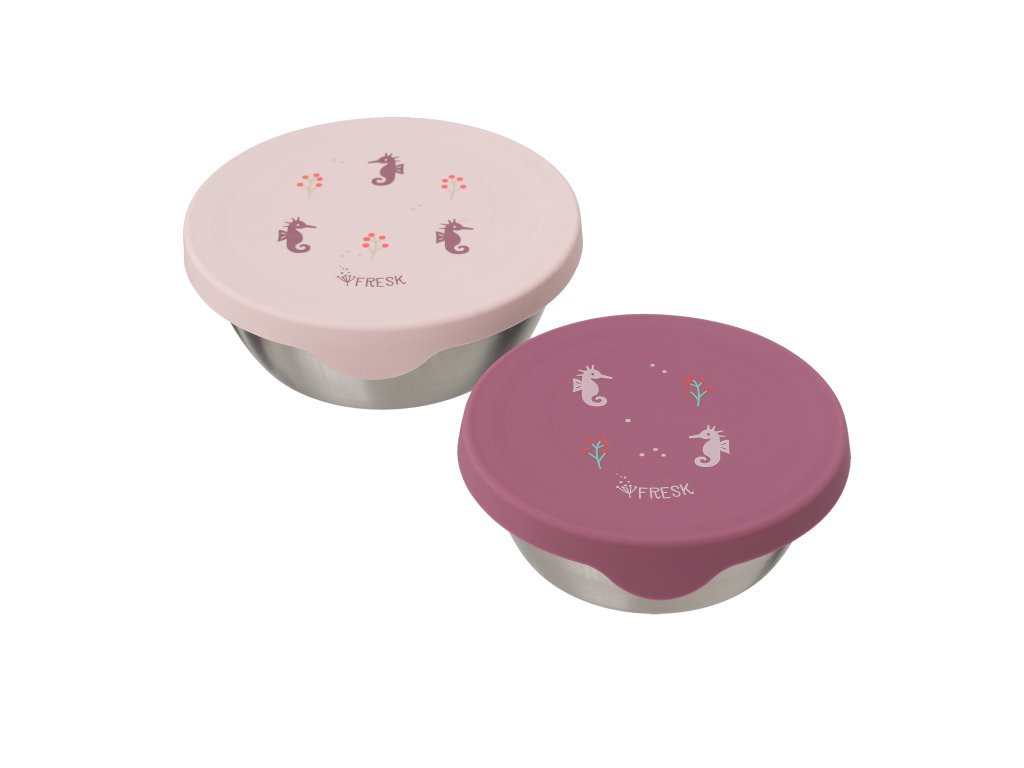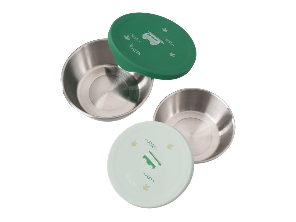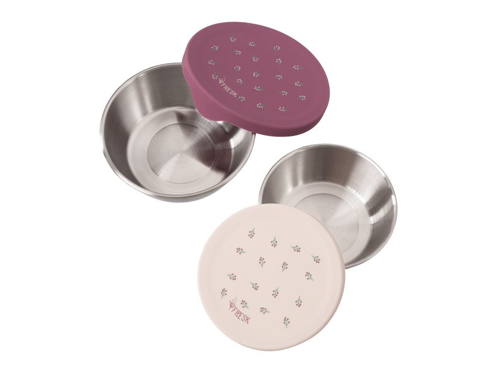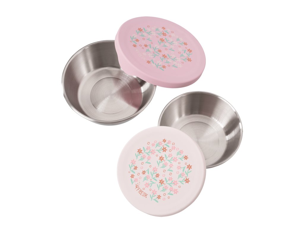Dve dózy sú vyrobené z pevnej nehrdzavejúcej ocele a majú praktické silikónové viečka. Oceľové dno zabezpečuje, že nenaťahujú farbu ani vôňu z potravín, a flexibilné silikónové viečko ľahko otvoria aj malé detské rúčky.